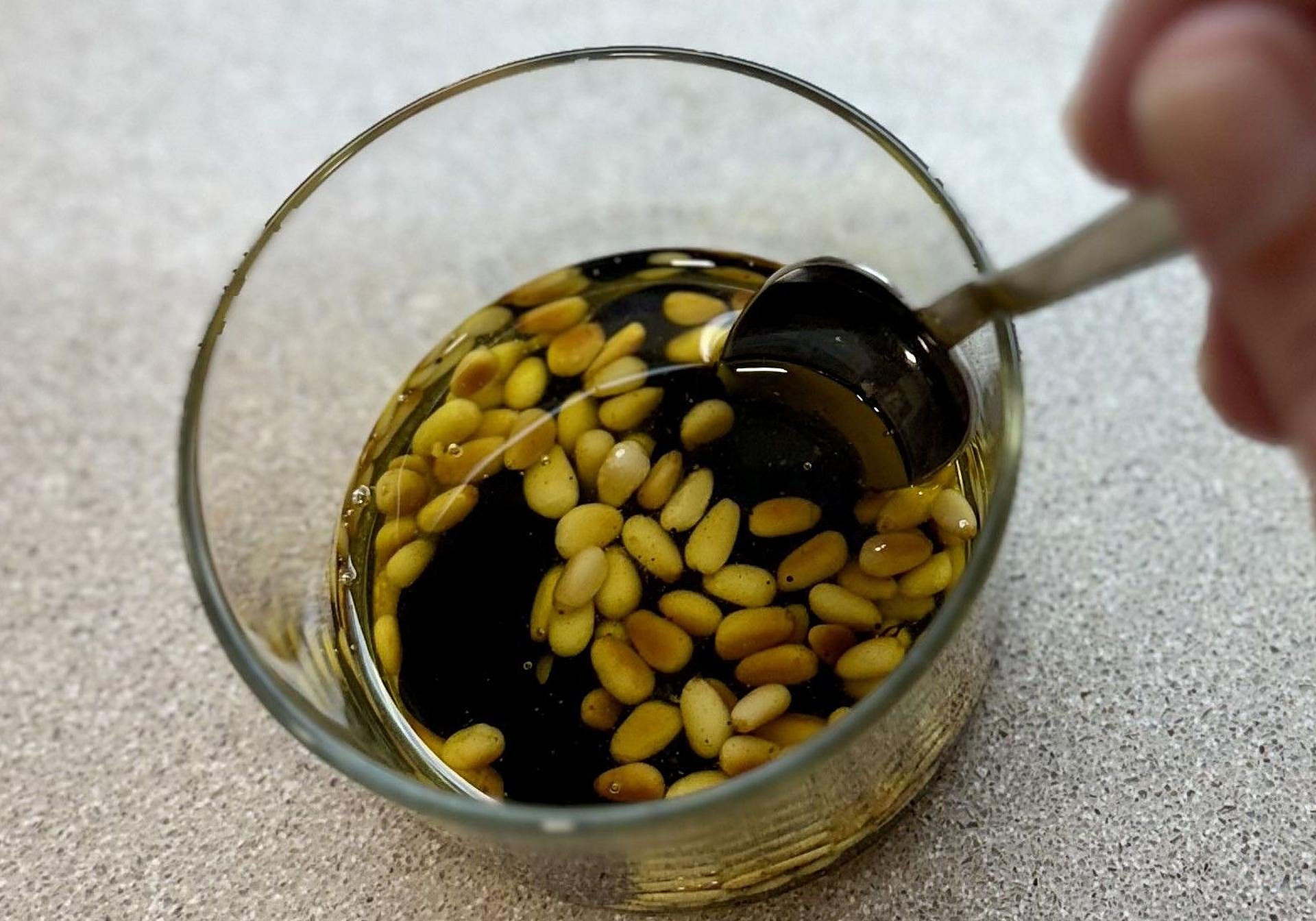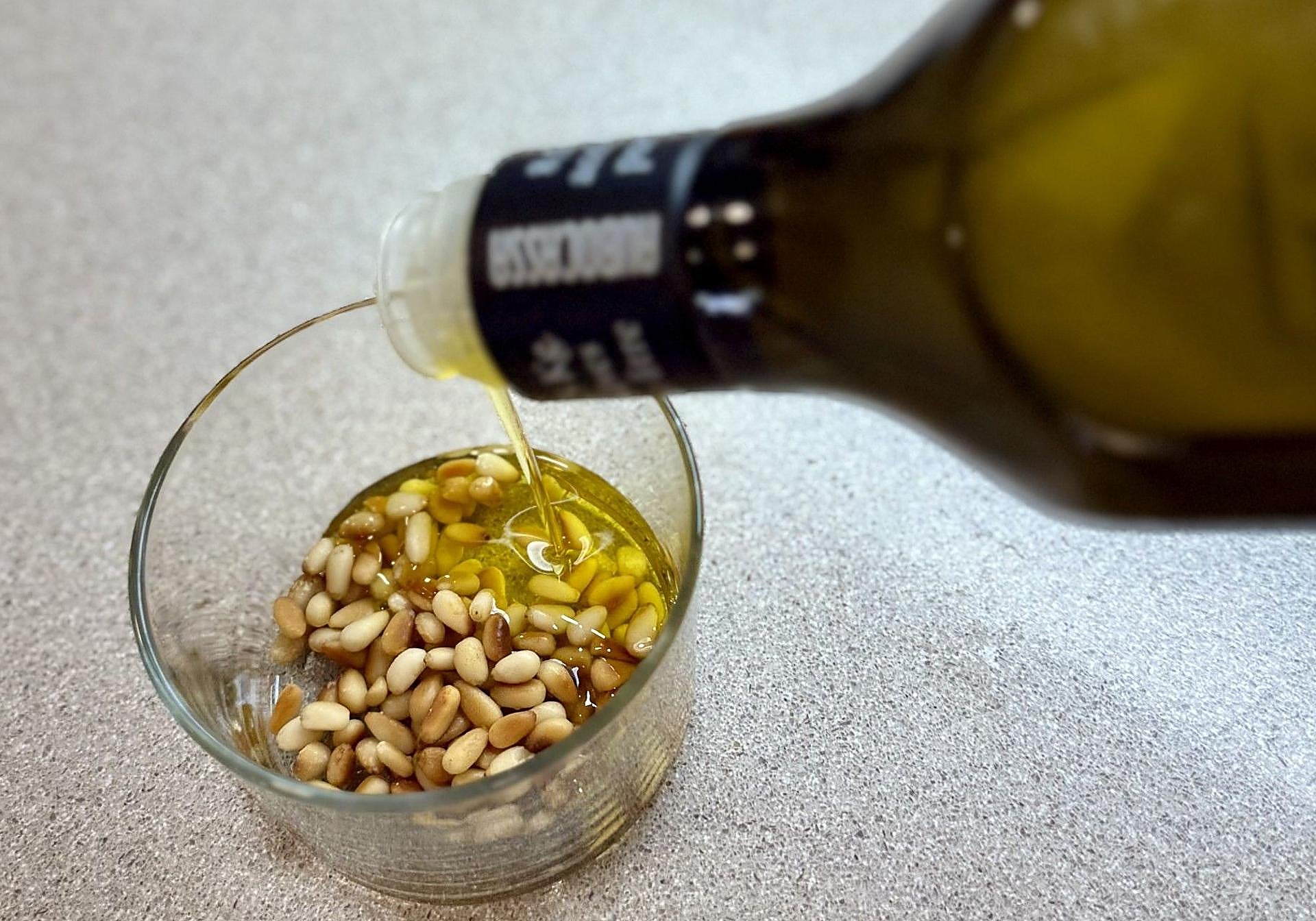 Añadiremos el aceite de oliva virgen extra sobre los piñones.