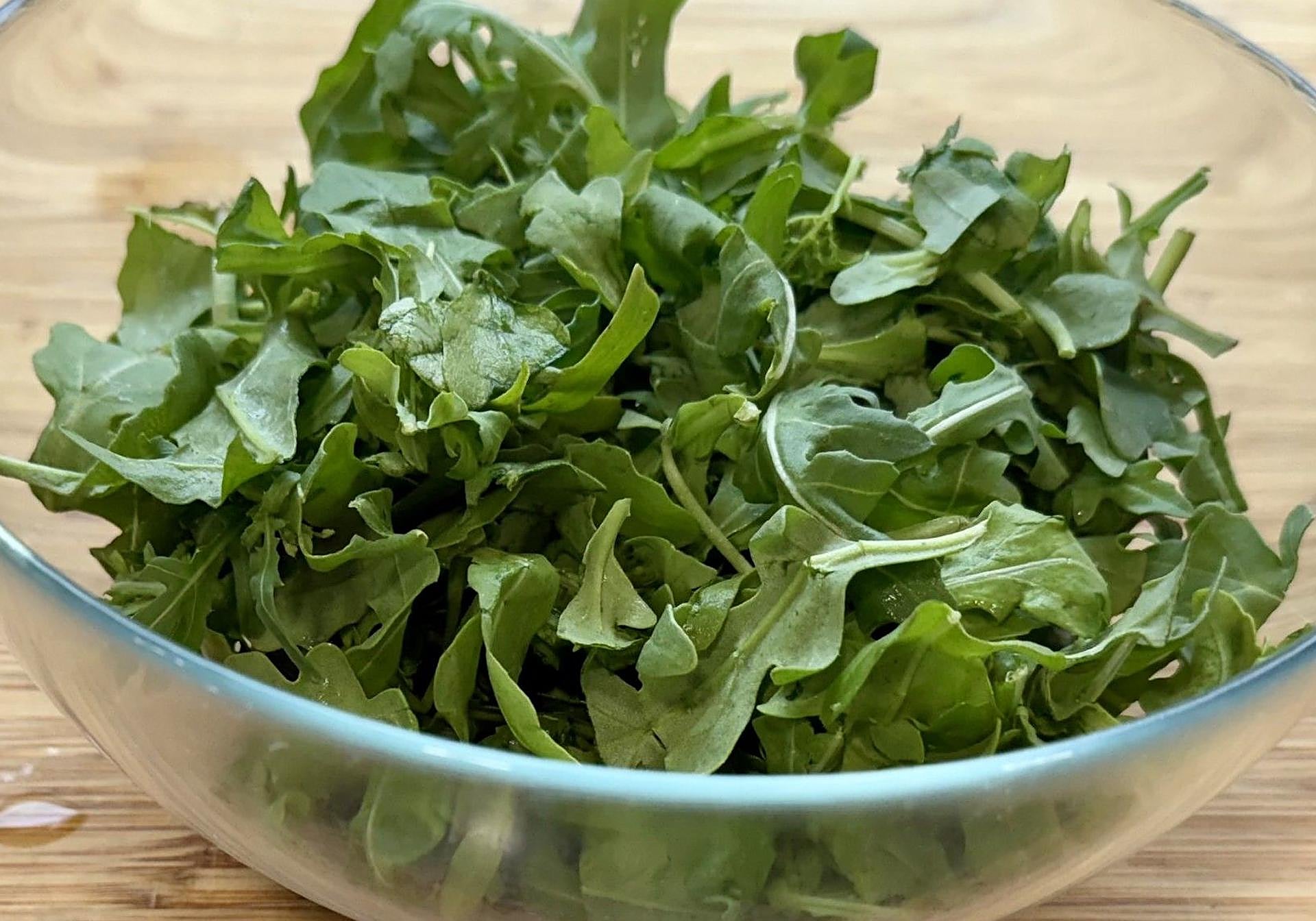 En lo que se caramelizan el bacon y las manzanas, iremos disponiendo en una fuente la rúcula.