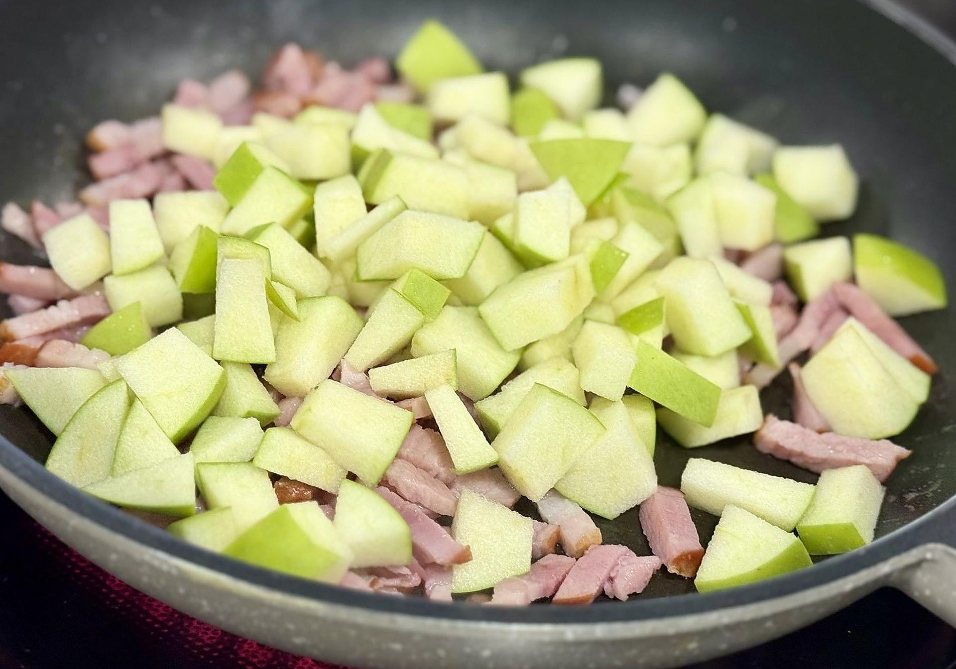 Y, por último, añadiremos la manzana y el bacon ligeramente caramelizados.