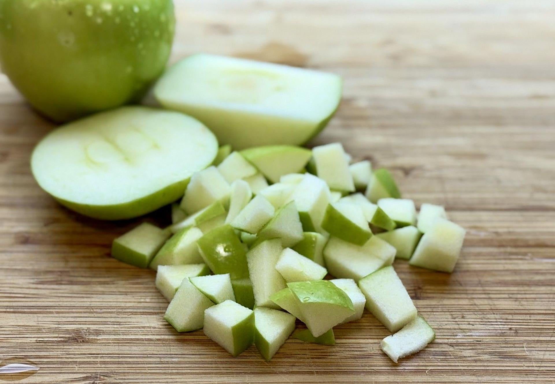 Mientras tanto, lavaremos y cortaremos la manzana en cubos pequeños.