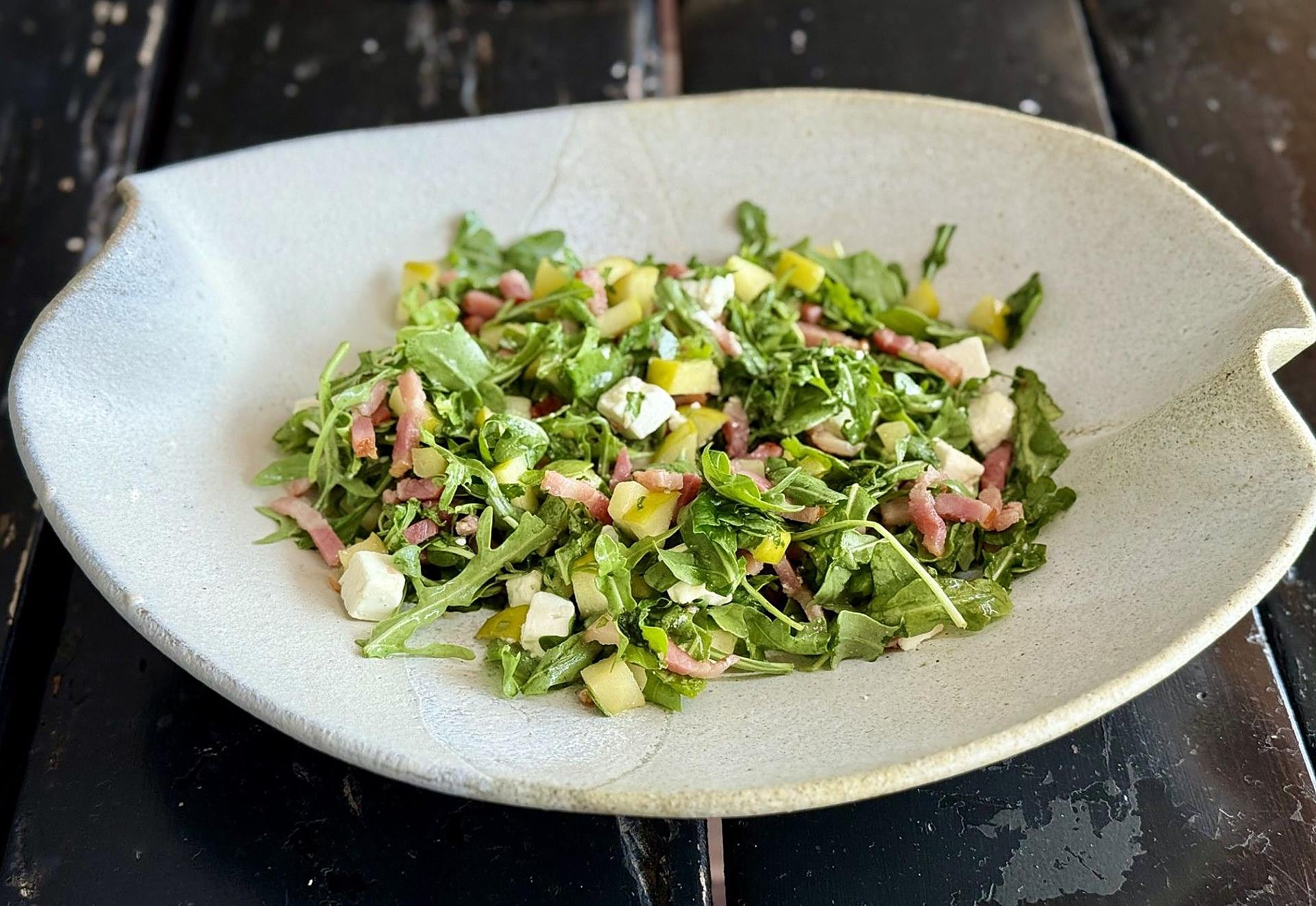 Una base de rúcula que también puedes sustituir por brotes tiernos, bacon en tiras, por eso de añadirle proteína con alegría, queso feta que siempre queda bien y un aliño especial y a la altura de lo que esta ensalada merece.