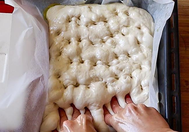 Precalentamos el horno a 220º y cuando haya alcanzado la temperatura, introducimos la masa. La parte más divertida: hundir los dedos para crear esos huecos y que se creen algunas burbujas.