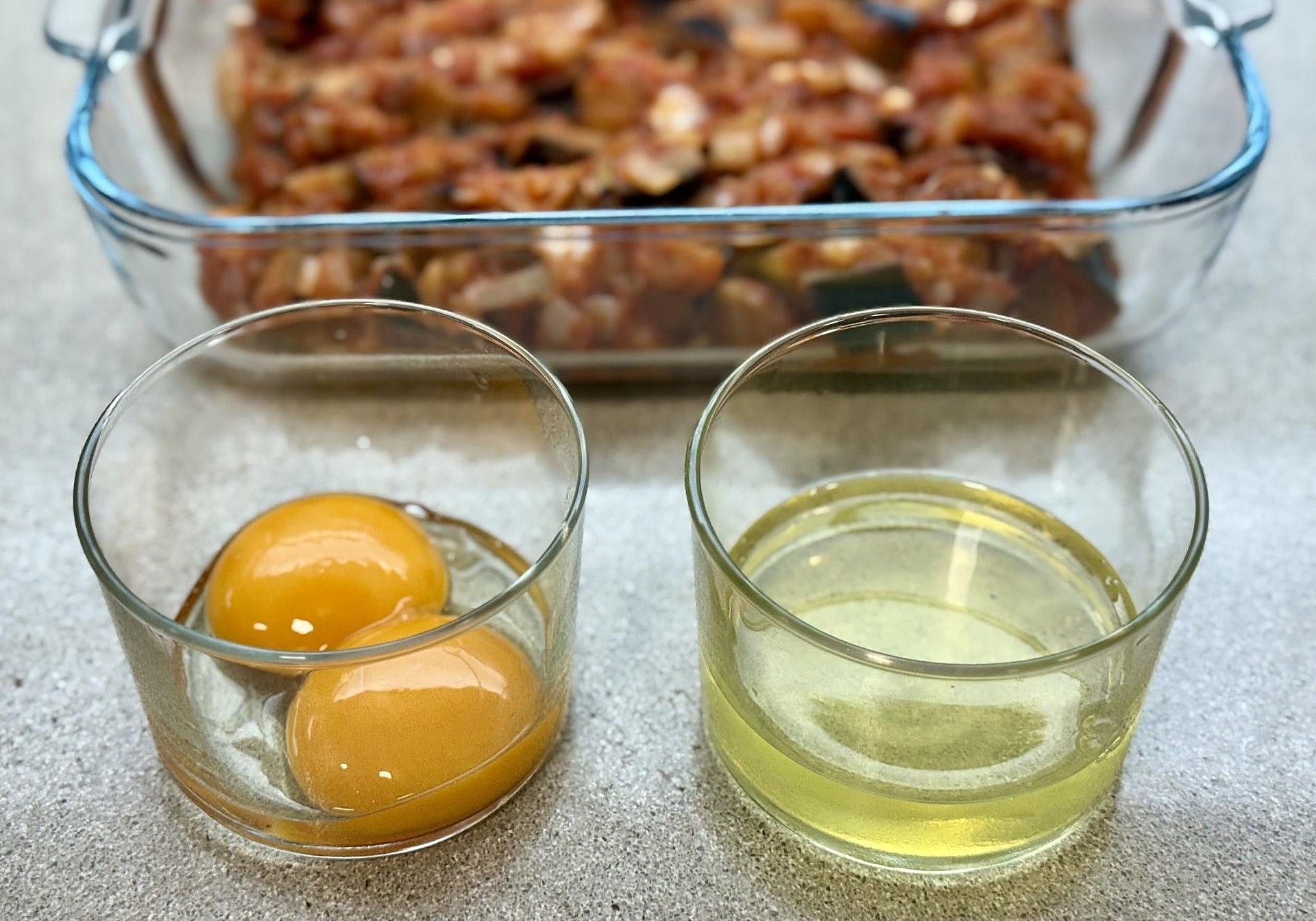 Sobre el sofrito de berenjena, verteremos primero las claras y, así mismo, meteremos la fuente en el horno, previamente caliente, durante 8 minutos a temperatura 190º, calor arriba y abajo. Reservamos las yemas.