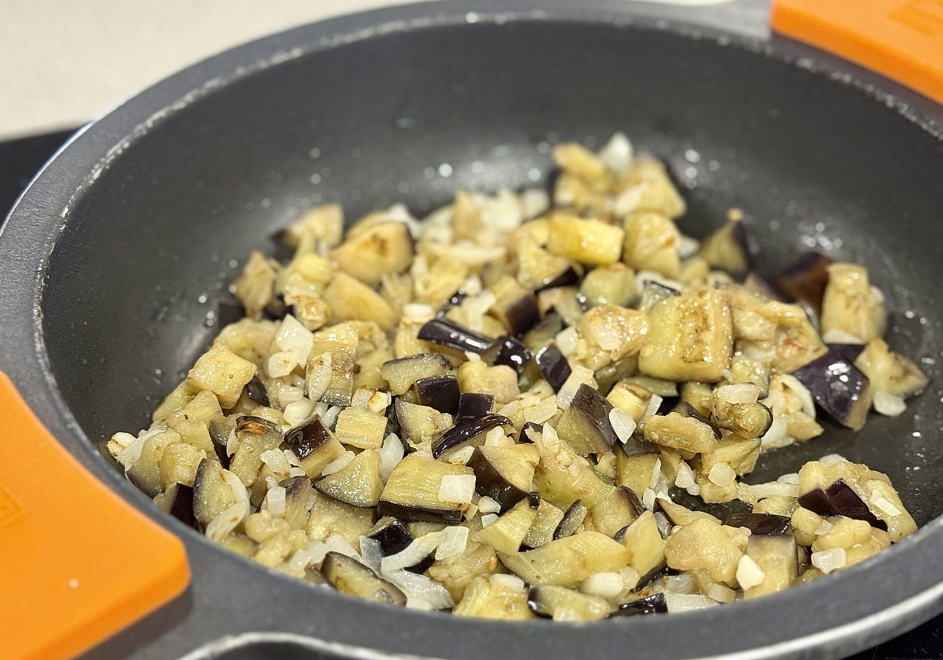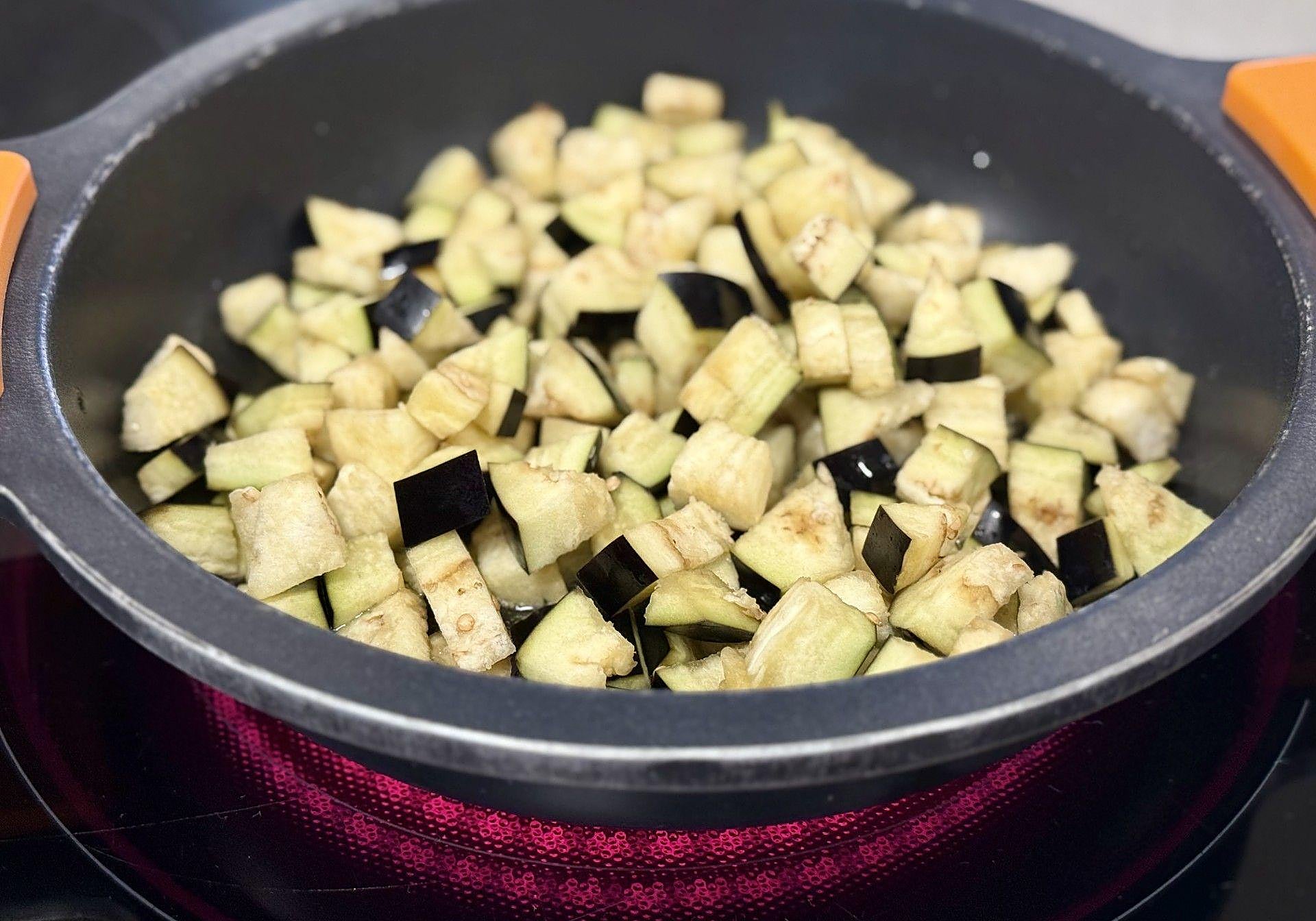 En un caldero amplio, calentaremos el aceite y saltearemos la berenjena a fuego medio-alto durante 5 minutos.