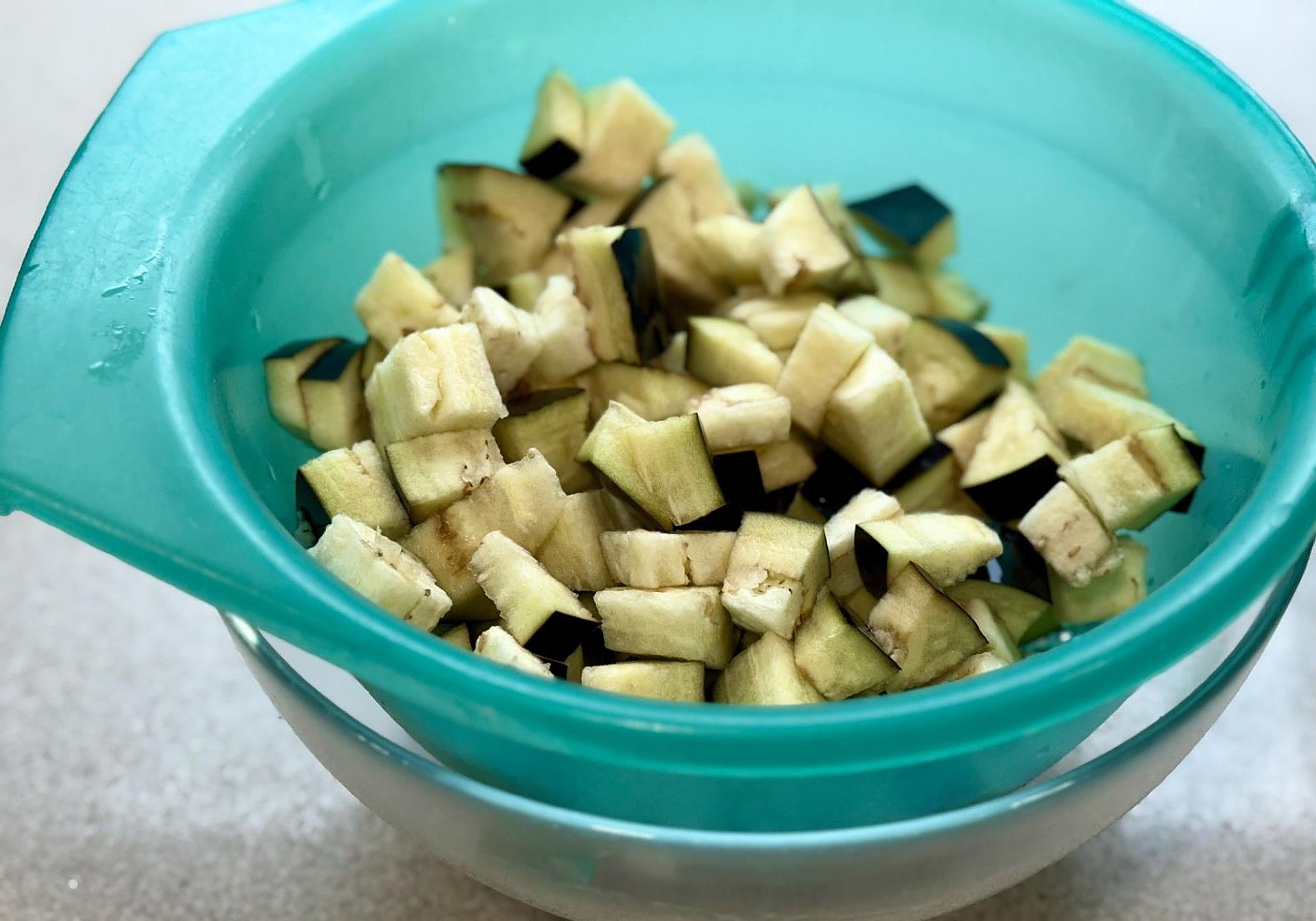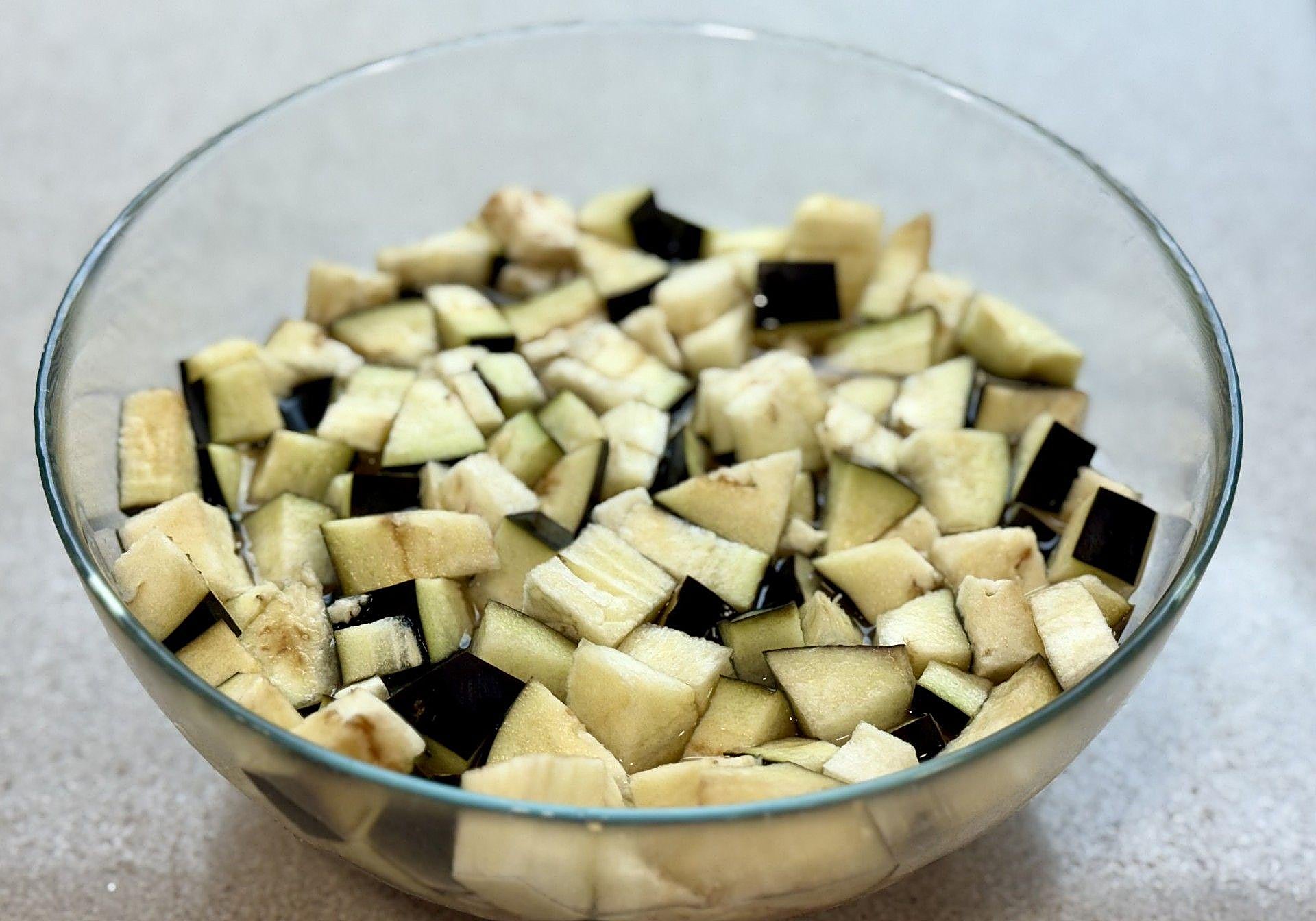 Comenzaremos cortando la berenjena en cubos y la dejaremos de remojo en agua y sal durante 20 minutos para que suelte el amargor.