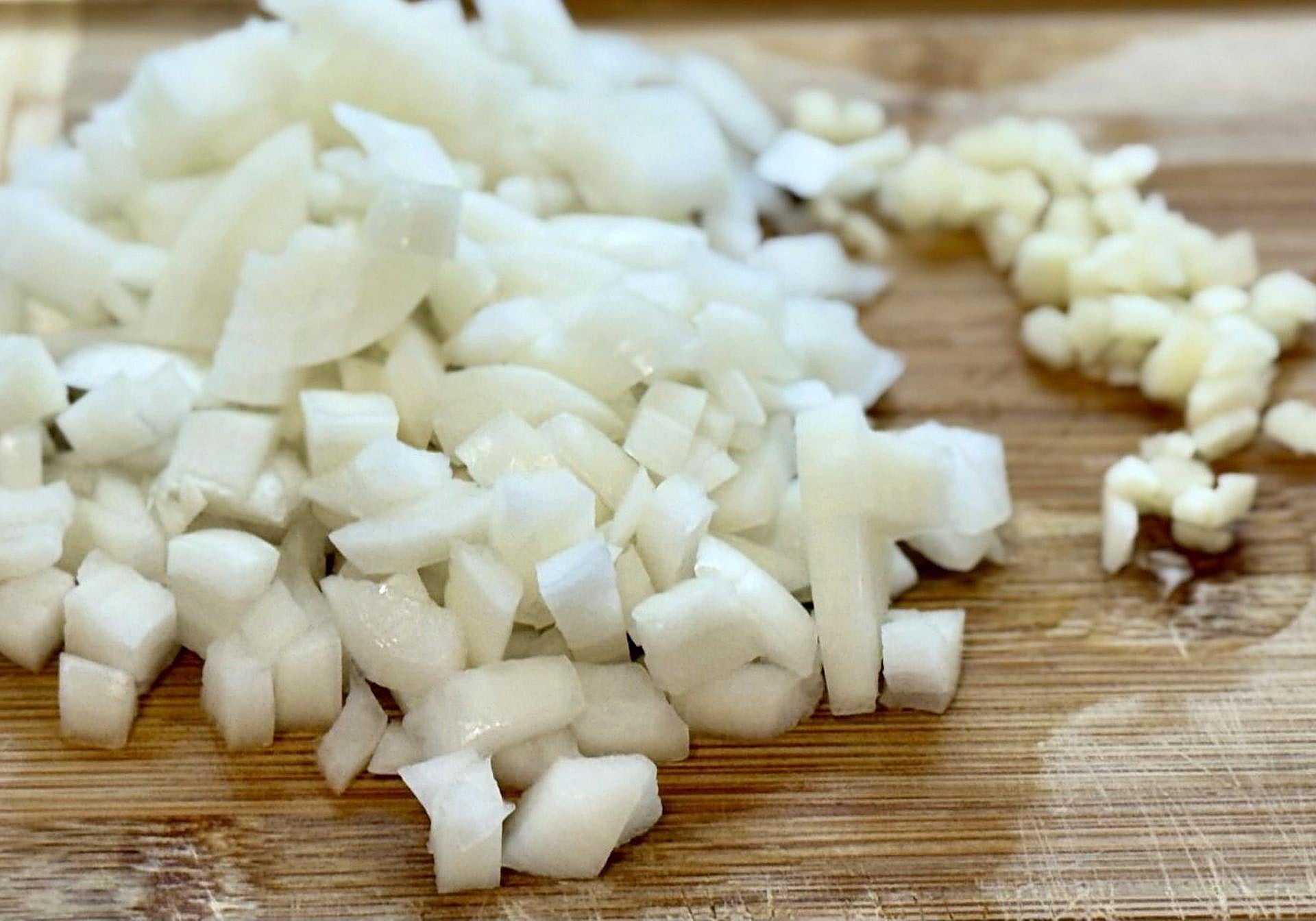 Mientras se saltea la berenjena, pelaremos y cortaremos la cebolla en brunoise y el ajo en pedacitos, retirándole el germen previamente.