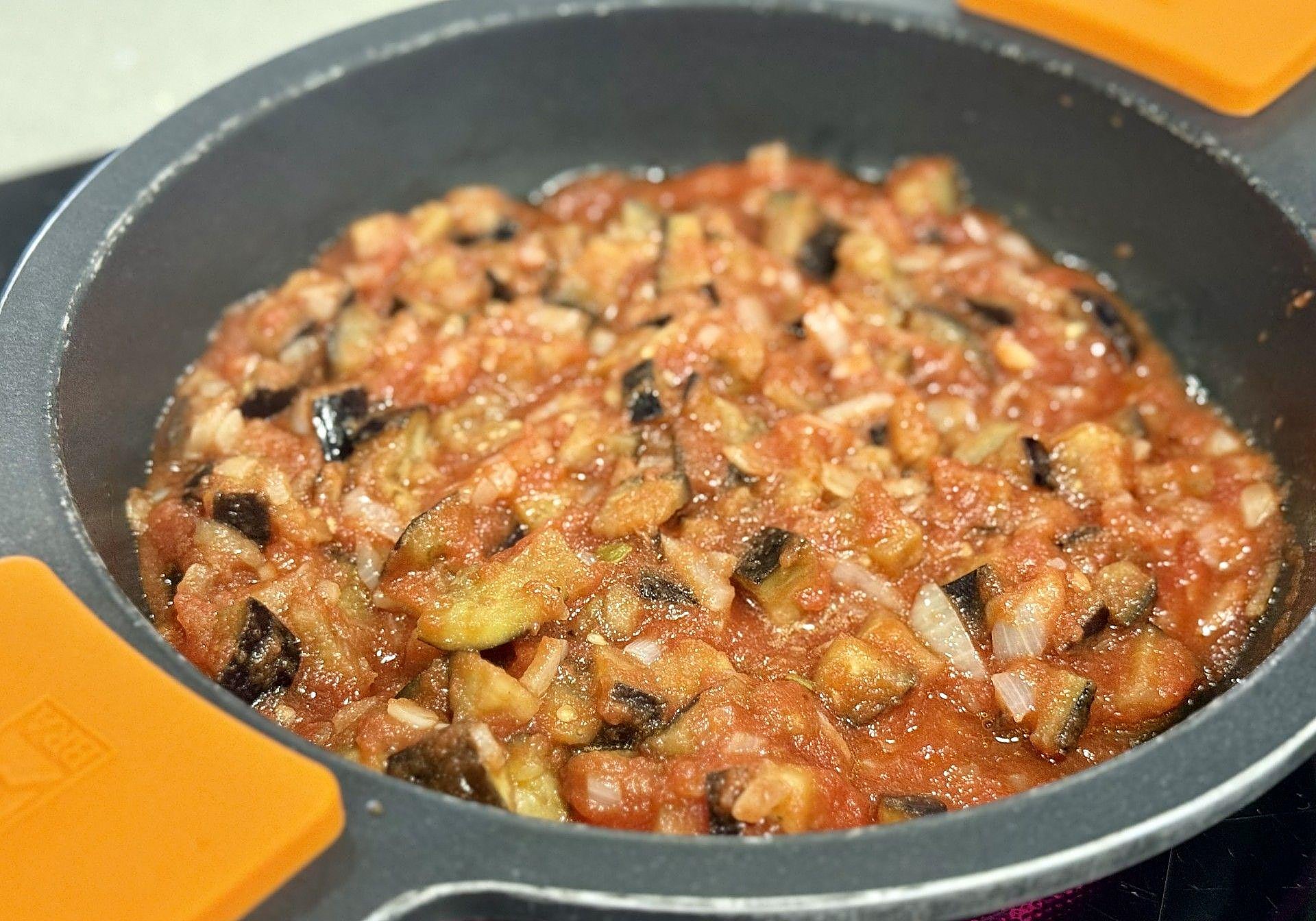Una vez sofritos, añadiremos de nuevo al caldero la berenjena.