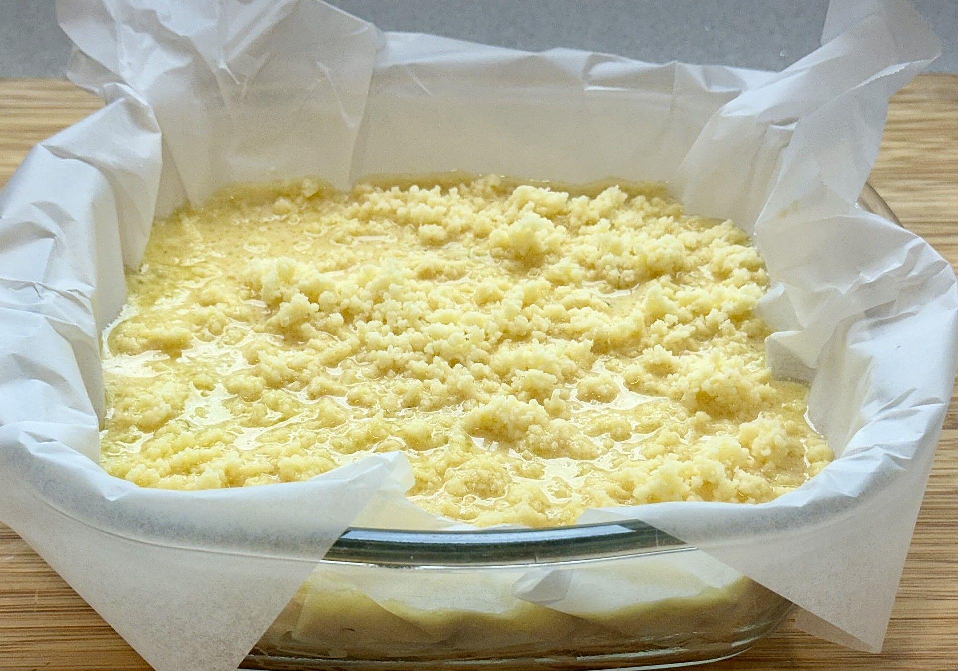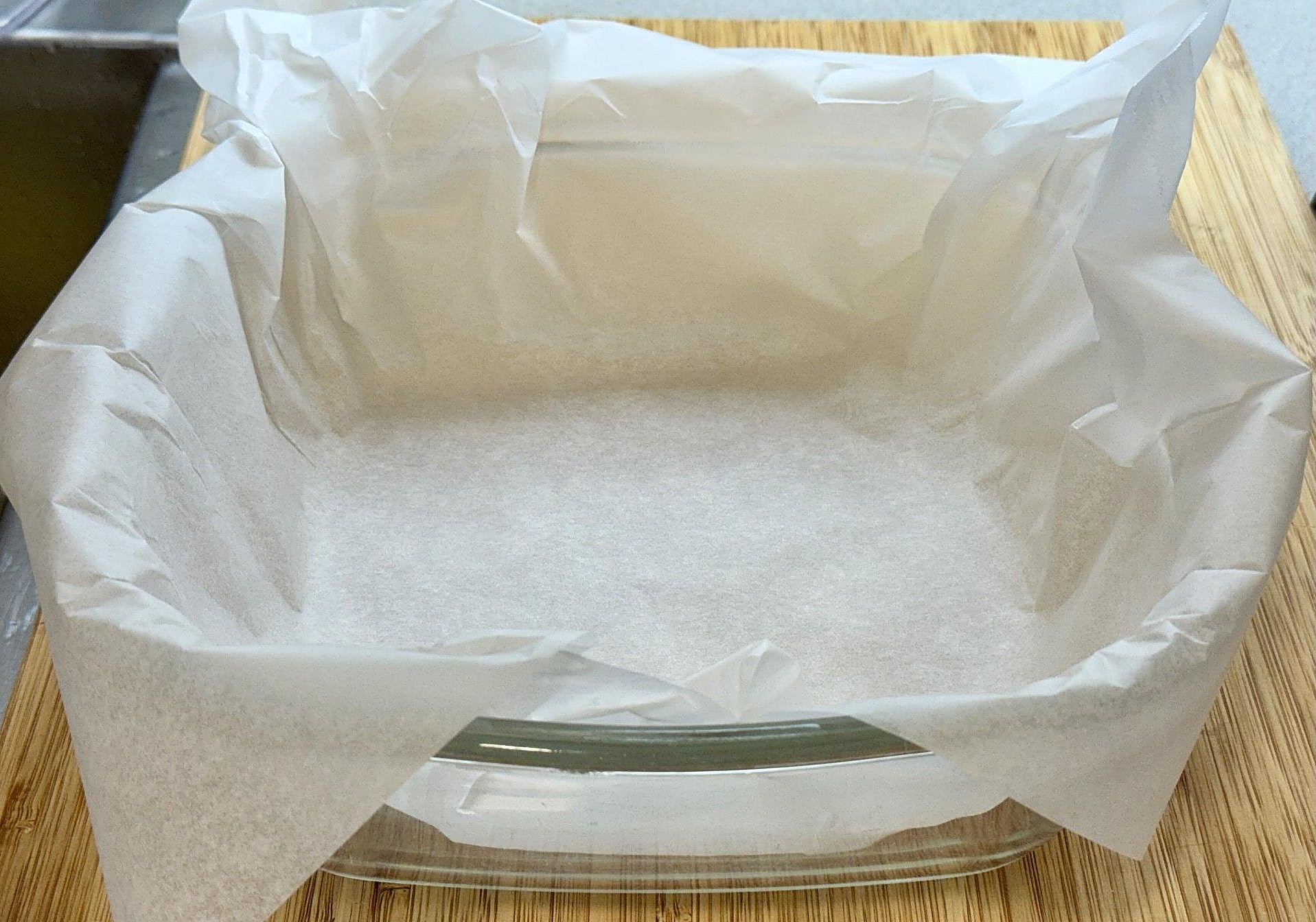 Justo es este momento podremos ir encendiendo el horno a 190º, calor arriba y abajo. Además, forraremos un molde apto para horno con papel de hornear.