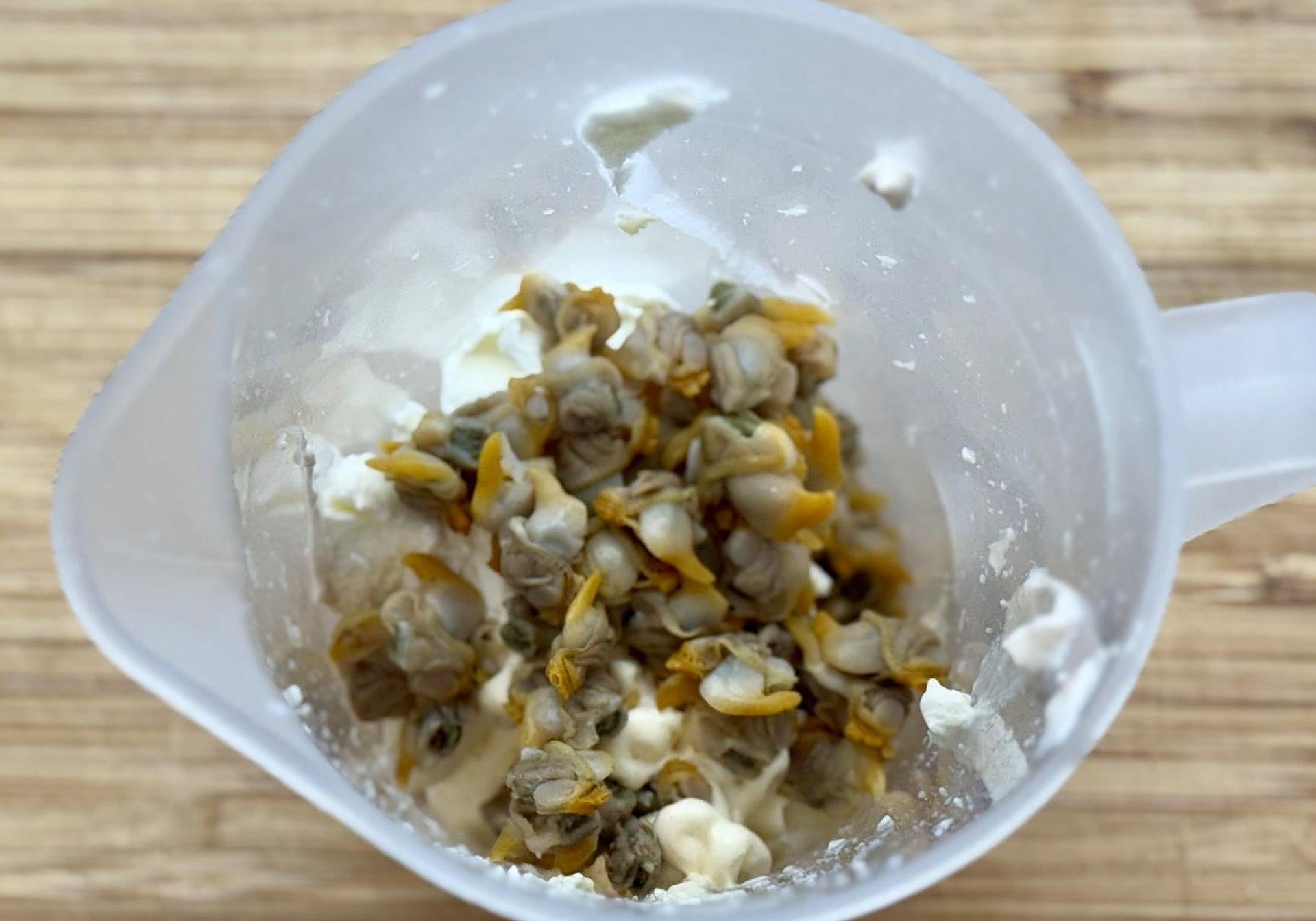 Y ya solo nos quedará culminar estos irresistibles aperitivos navideños con los berberechos. Batimos con el queso, la mayonesa y el limón y guardamos alguno como decoración.