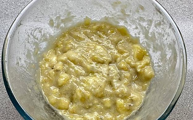 Este es el momento idóneo para encender el horno a 180º calor arriba y abajo. En un bol aparte, partiremos los plátanos y los iremos haciendo papilla con la ayuda de un tenedor.