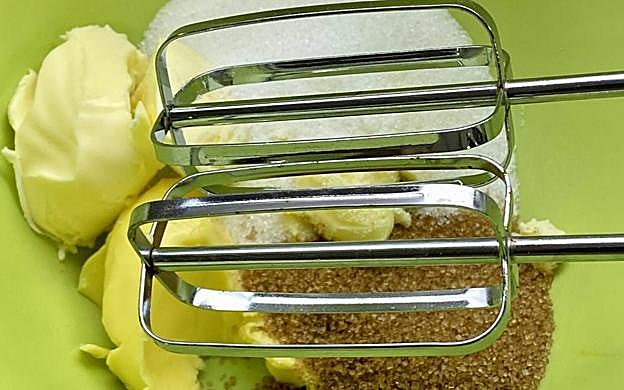 En un recipiente ancho, batiremos, a ser posible con varillas eléctricas, los dos azúcares con la mantequilla.