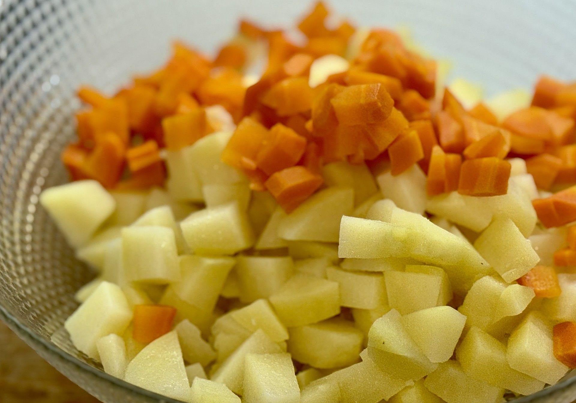 Una vez tengamos cocidos estos tres ingredientes comenzaremos pelando las papas y cortándolas en cuadraditos. Dispondremos las papas peladas y cortadas en una ensaladera.