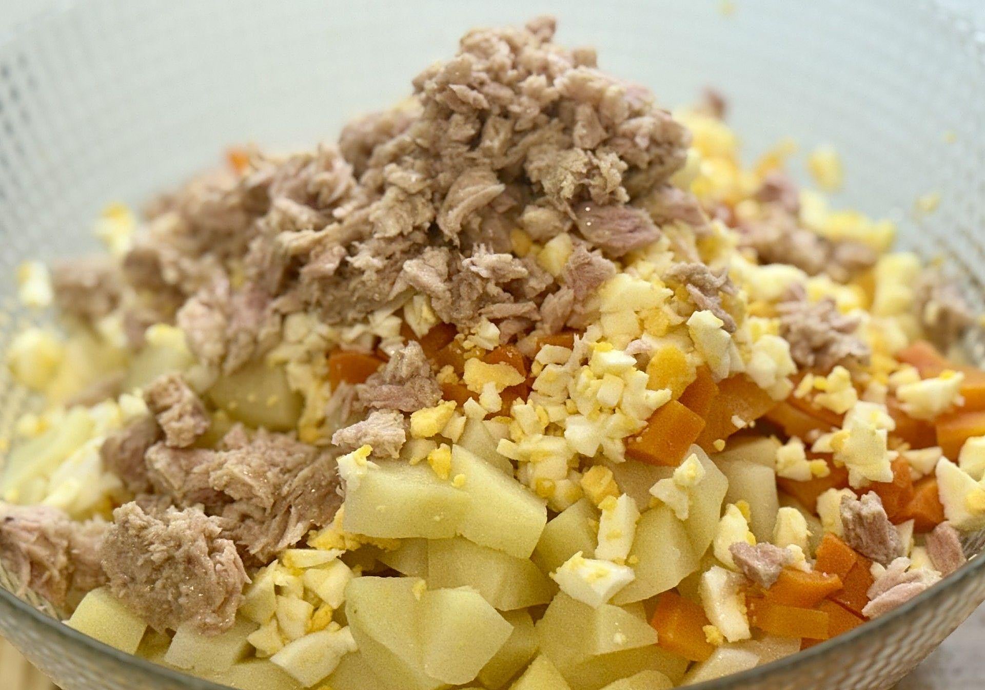 Escurriremos el atún, bien del aceite o bien del escabeche, según gustos, lo desmenuzaremos y lo incorporaremos a la ensaladera.