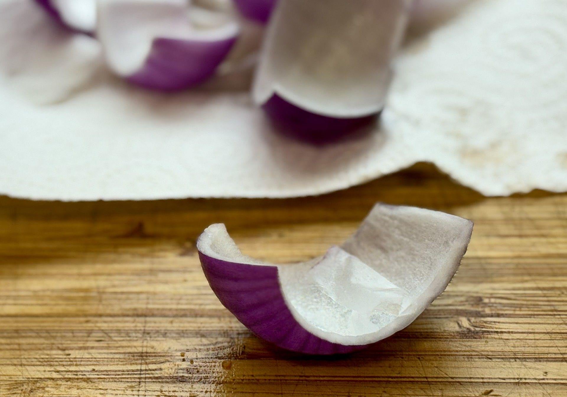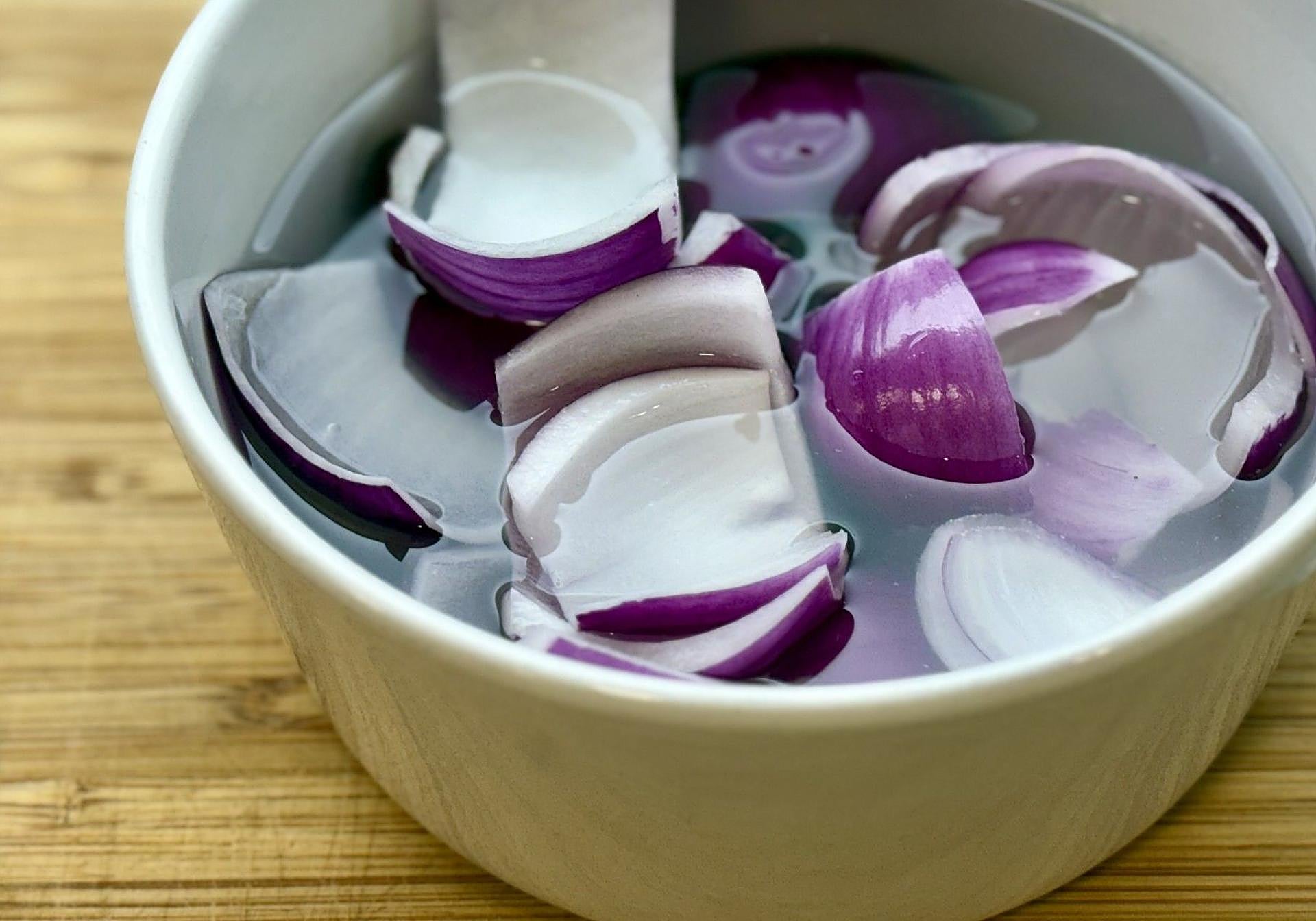 Comenzaremos pelando y separando por gajos la cebolla para dejarla en remojo, con ello restaremos el picor.