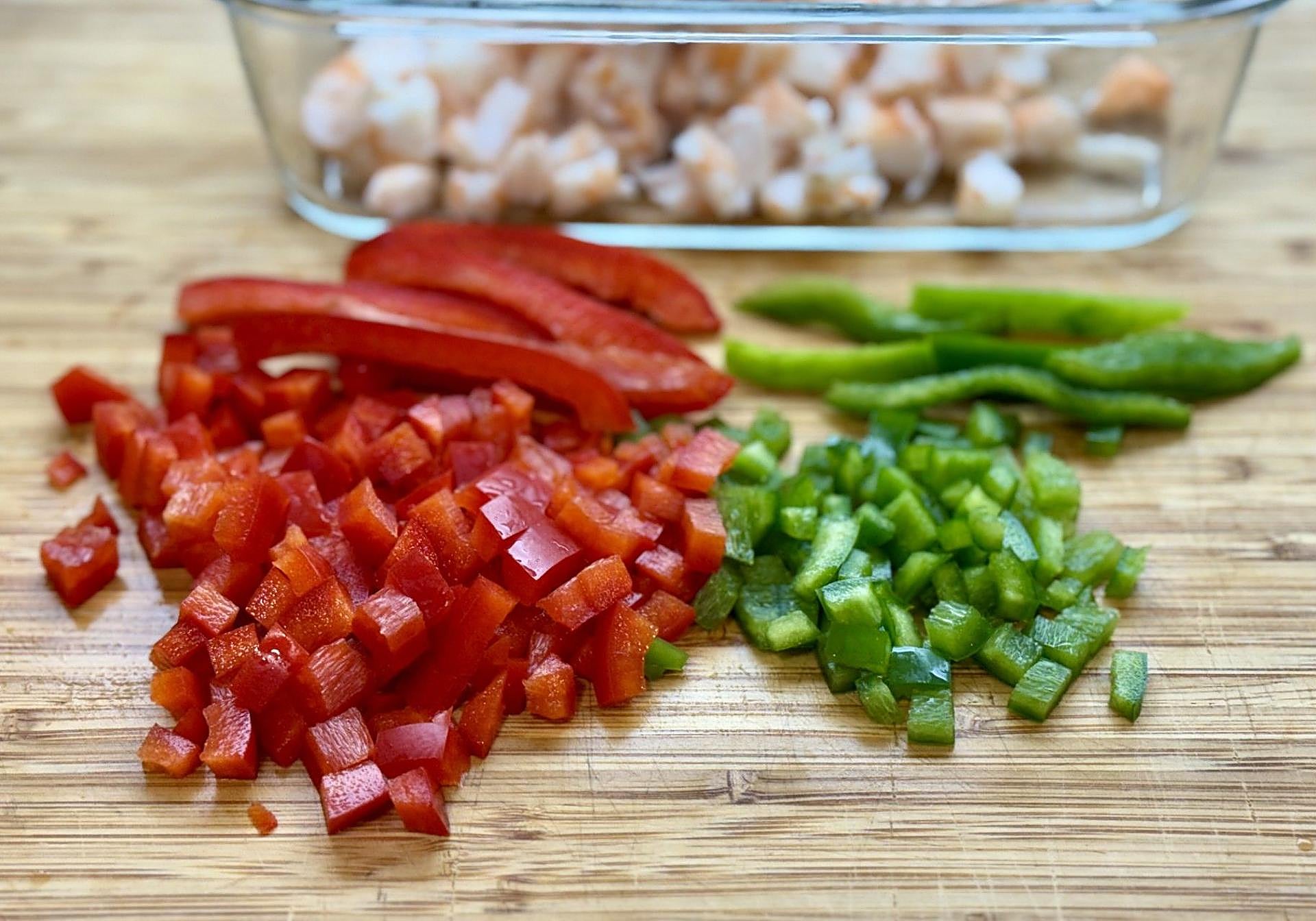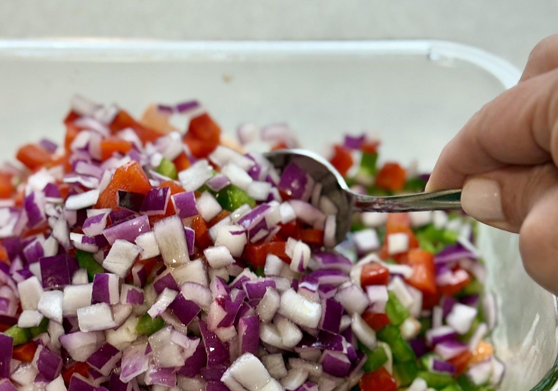 Ingredientes esenciales como el pimiento verde y el pimiento rojo, que estén bien firmes y una buena cebolla morada, de Gáldar o de Lanzarote y ya tendremos el 50% de éxito con esta versión que hoy les propongo.