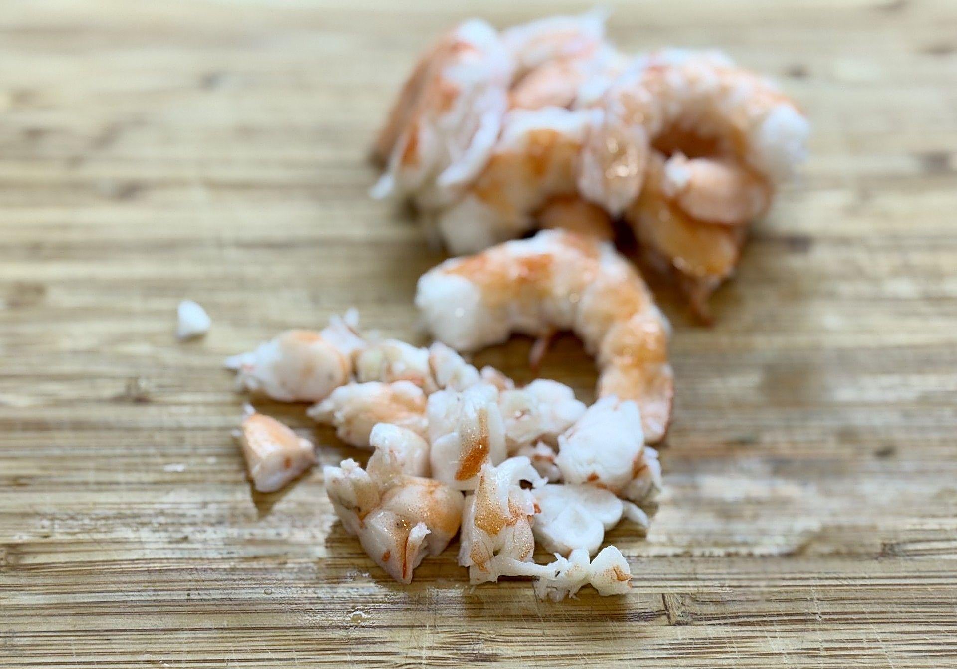 Mientras tanto, iremos pelando y cortando en pedacitos los langostinos.