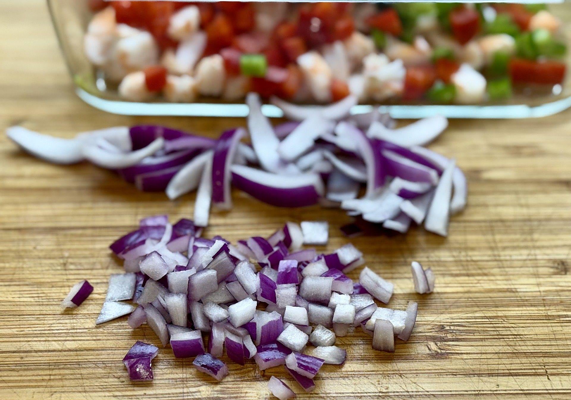Cortaremos la cebolla en pedacitos, procurando el mismo tamaño en el que hemos cortado los ingredientes anteriores. Mezclaremos con estos.