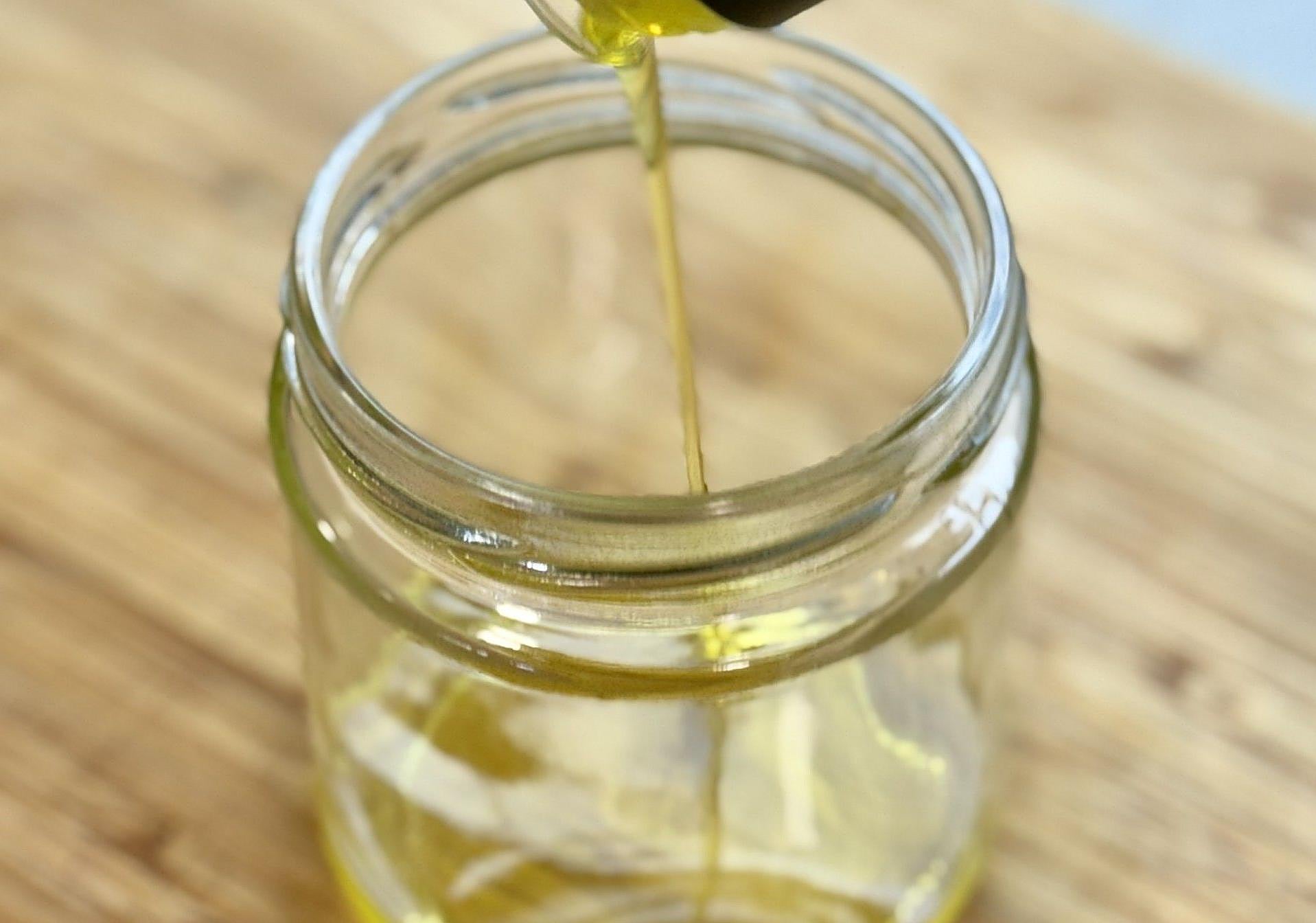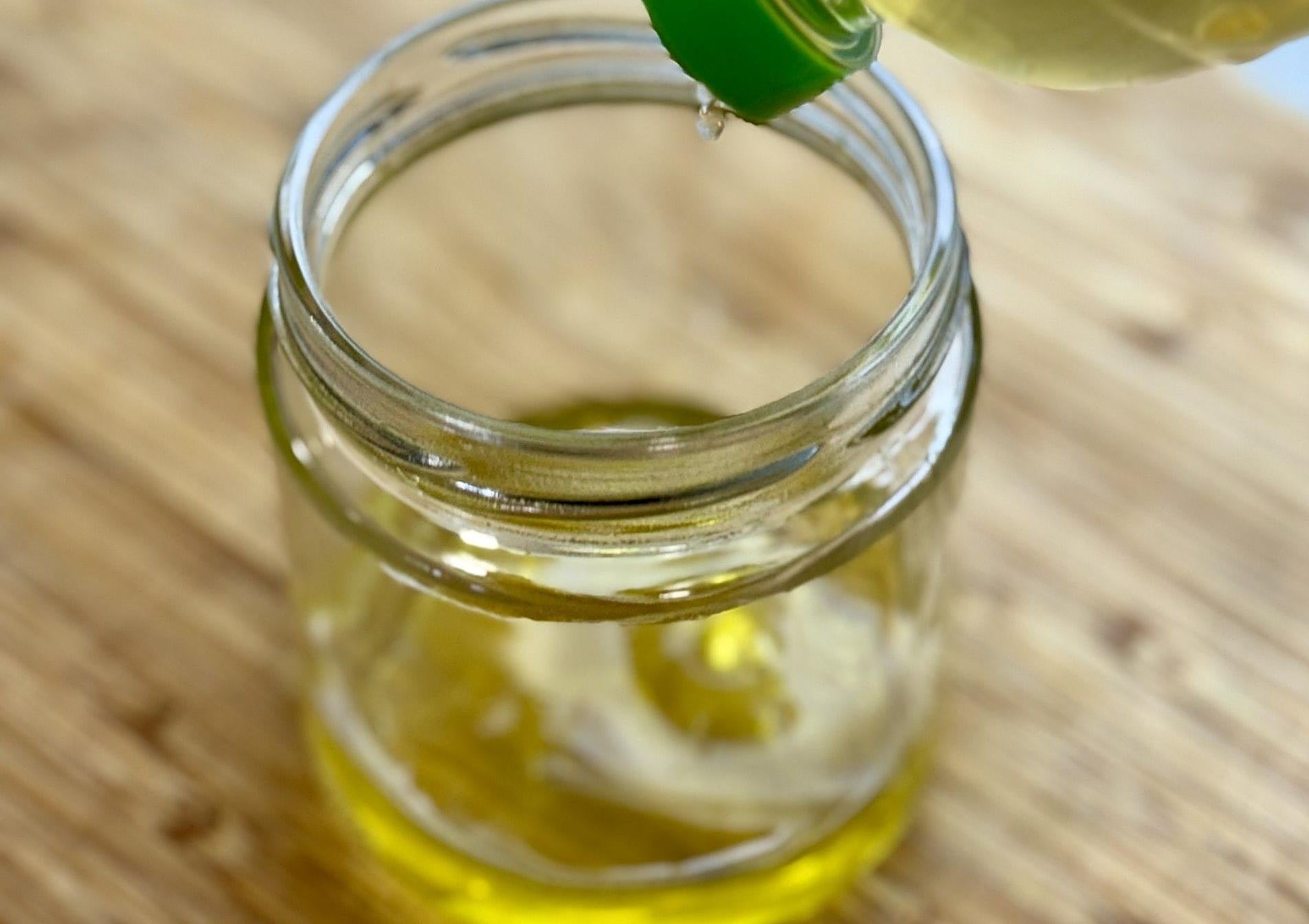 Taparemos y dejaremos enfriar en la nevera porque, el aliño no lo prepararemos hasta el momento de servir. Para ello, dispondremos en un tarro de cristal, primeramente, el aceite.