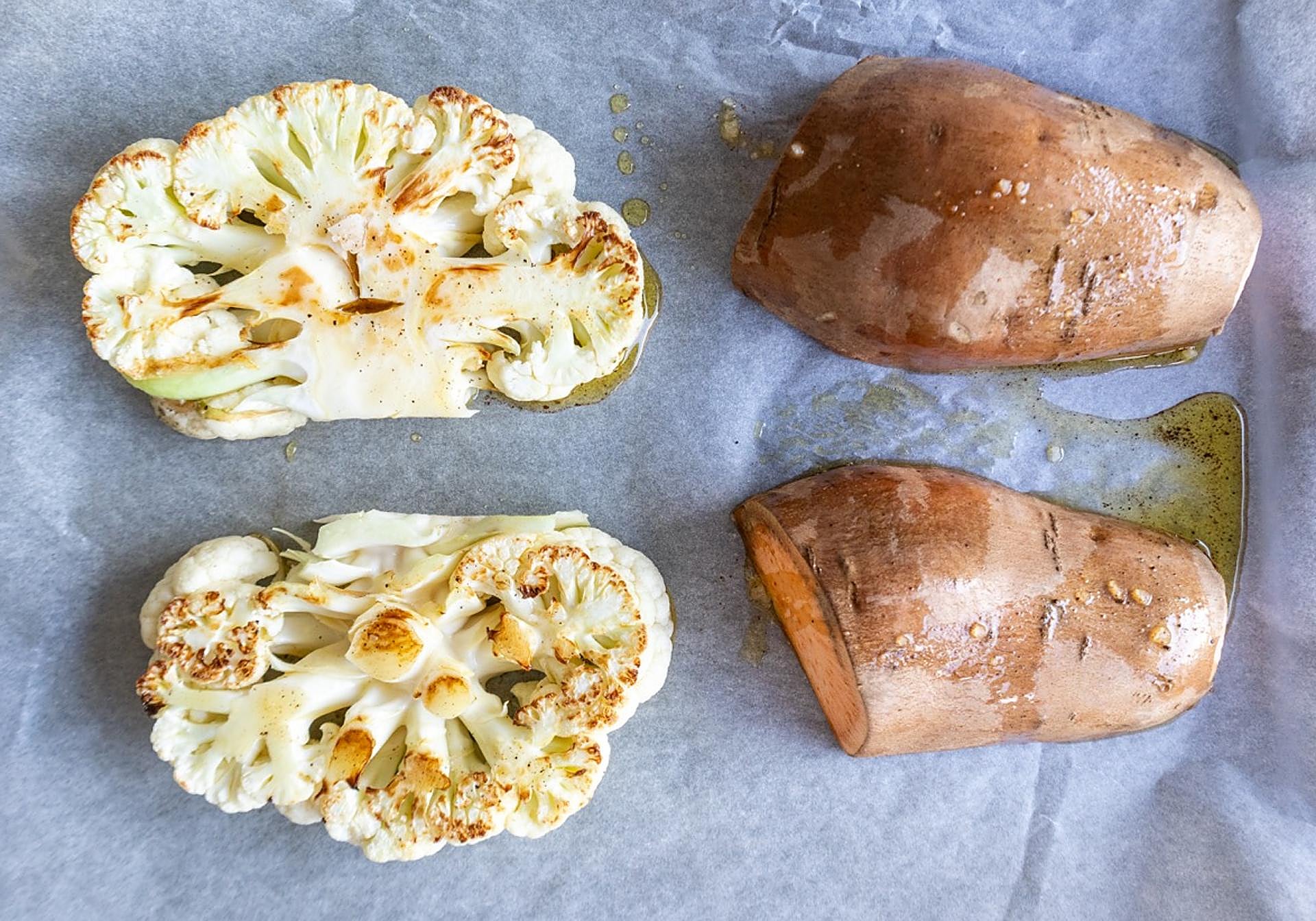 Colocamos las rodajas de coliflor y la batata (piel hacia arriba) en una bandeja de horno forrada con papel vegetal. Horneamos a 180ºC durante 30-35 minutos, dándoles la vuelta a los filetes a mitad de cocción para que queden doradas y tiernas por ambos lados.