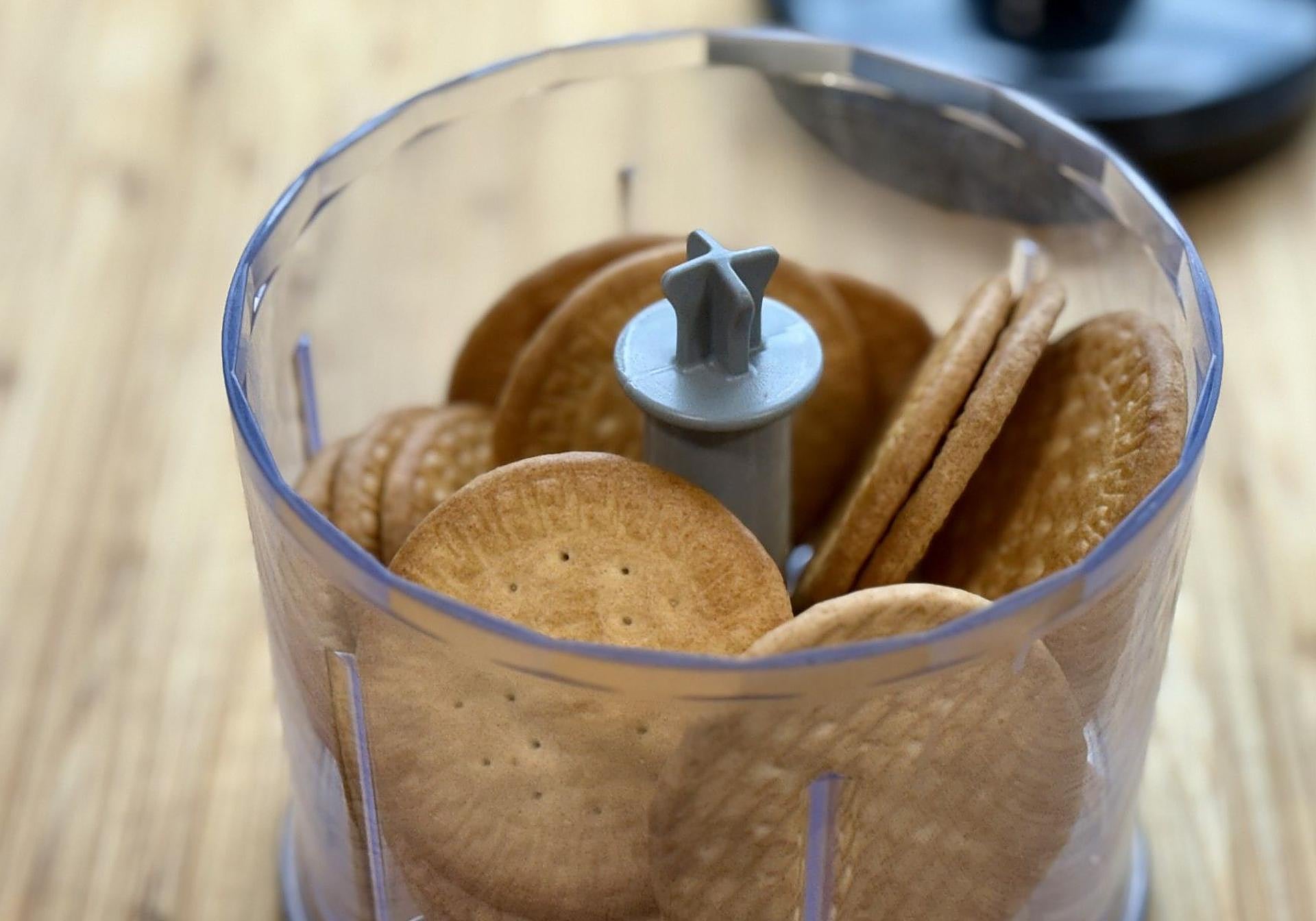 Mientras tanto podremos ir montando la base de la tarta y para ello, trituraremos las galletas, bien con picadora o bien triturándolas con ayuda de un rodillo.