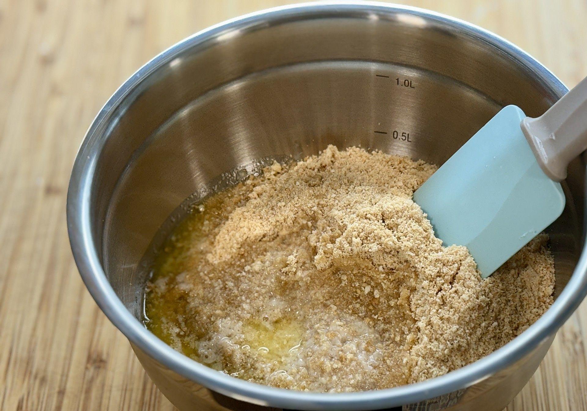 Dispondremos las galletas trituradas en una fuente, derretimos la mantequilla y mezclaremos ambas.