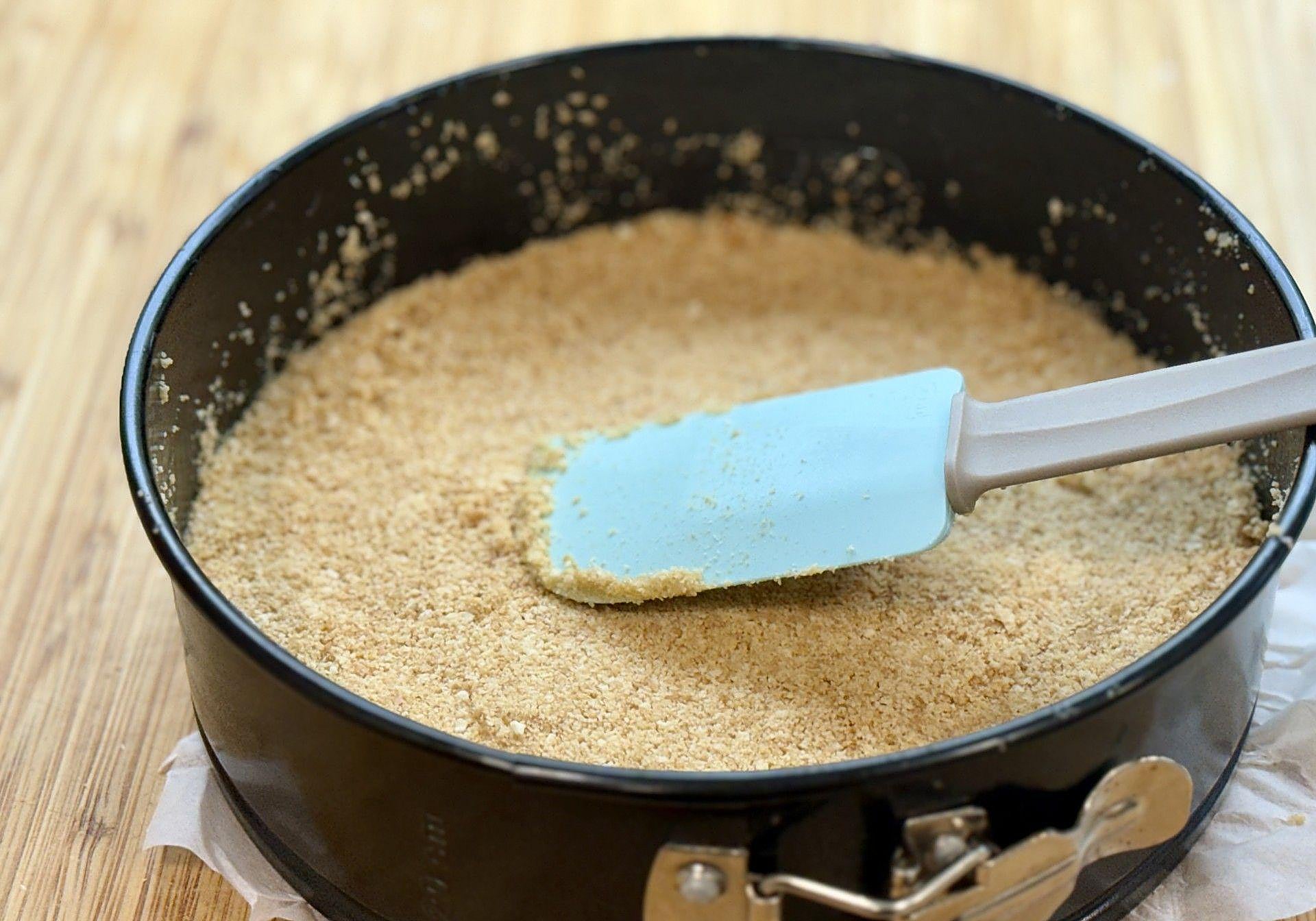 Con ayuda de una espátula de silicona, iremos depositando la mezcla de galletas y mantequilla hasta conformar la base de la tarta. Reservamos tapada en la nevera para que compacte mejor.