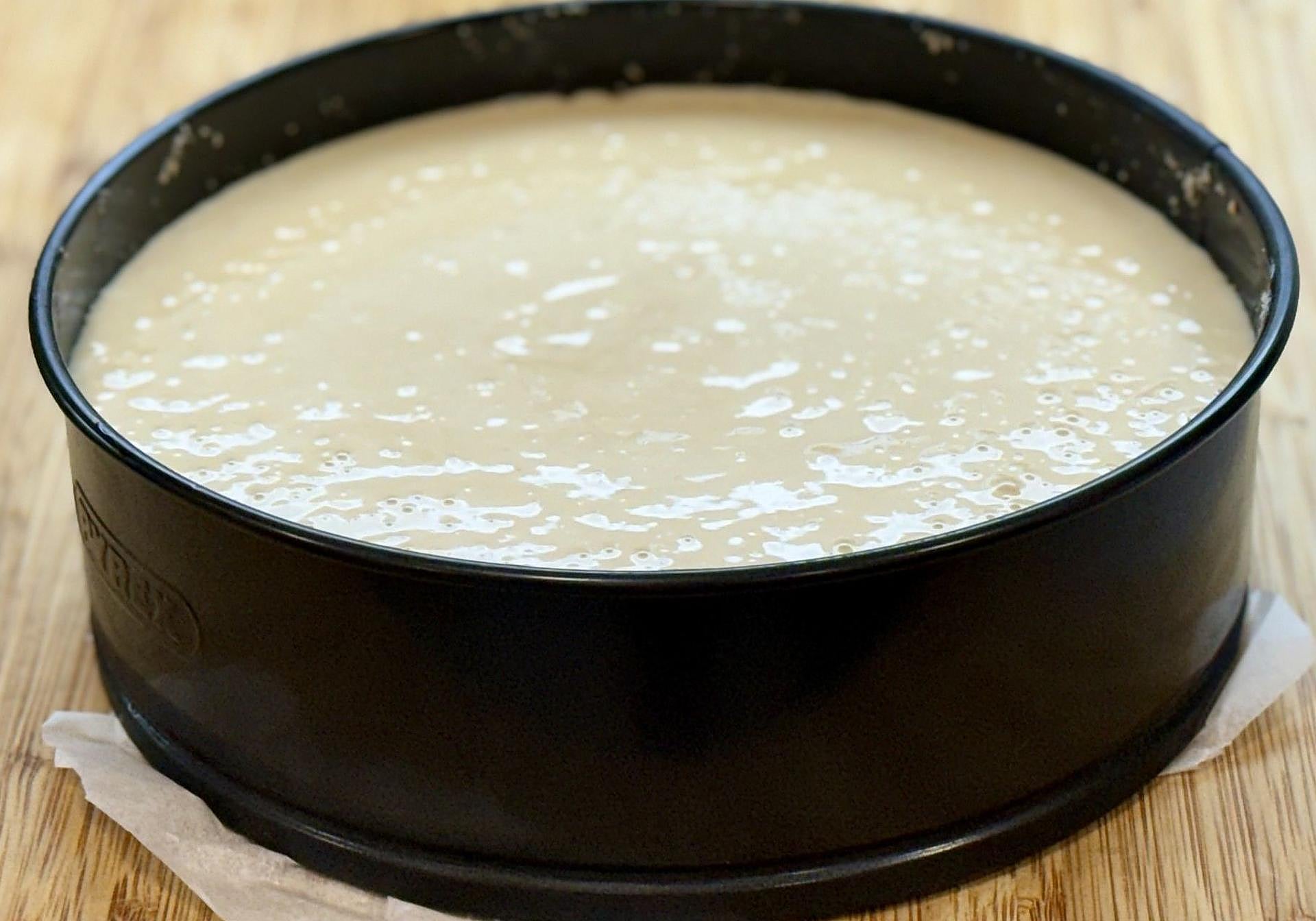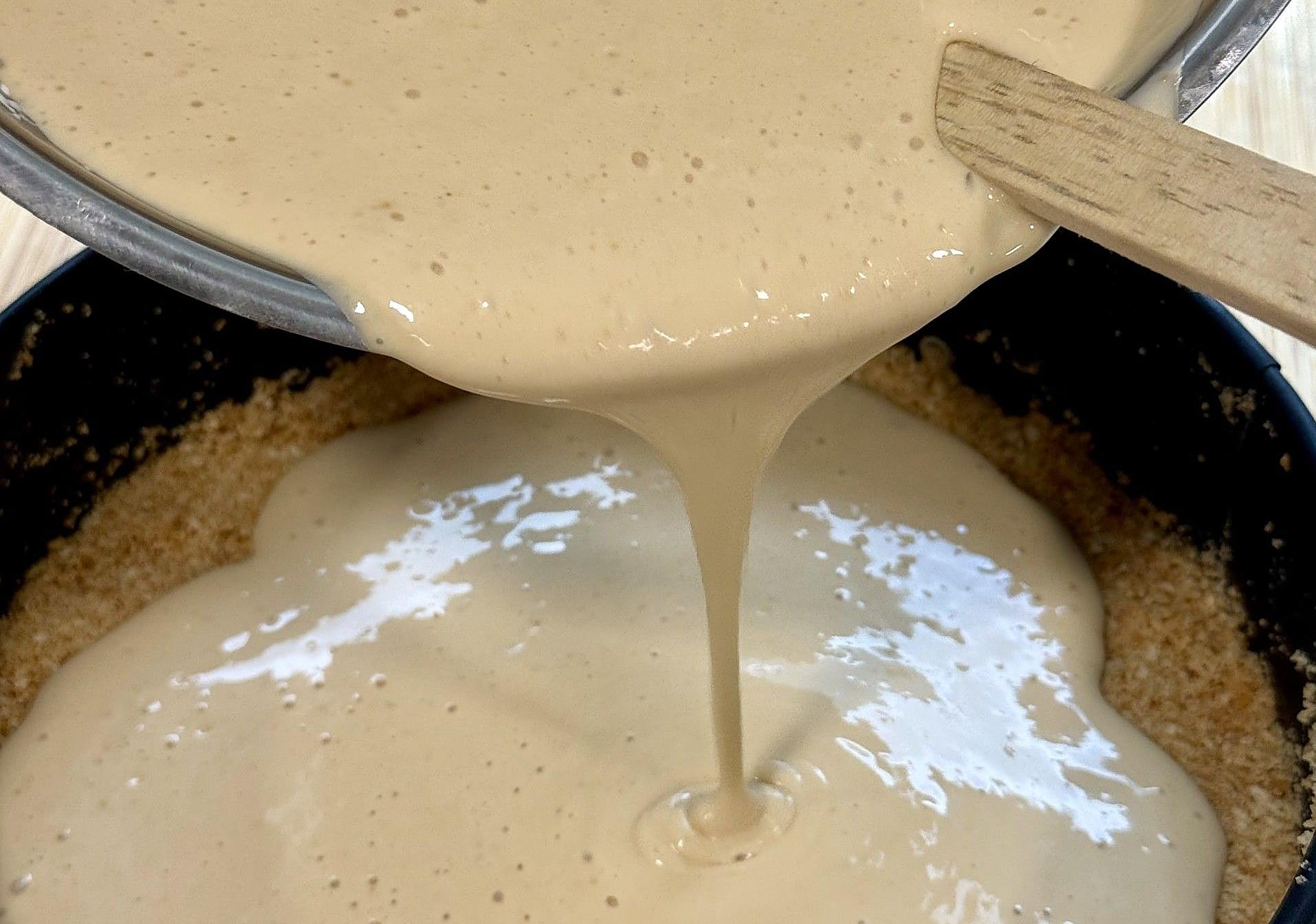 Recuperaremos de la nevera el molde para tarta con la base y verteremos la mezcla dentro del mismo.