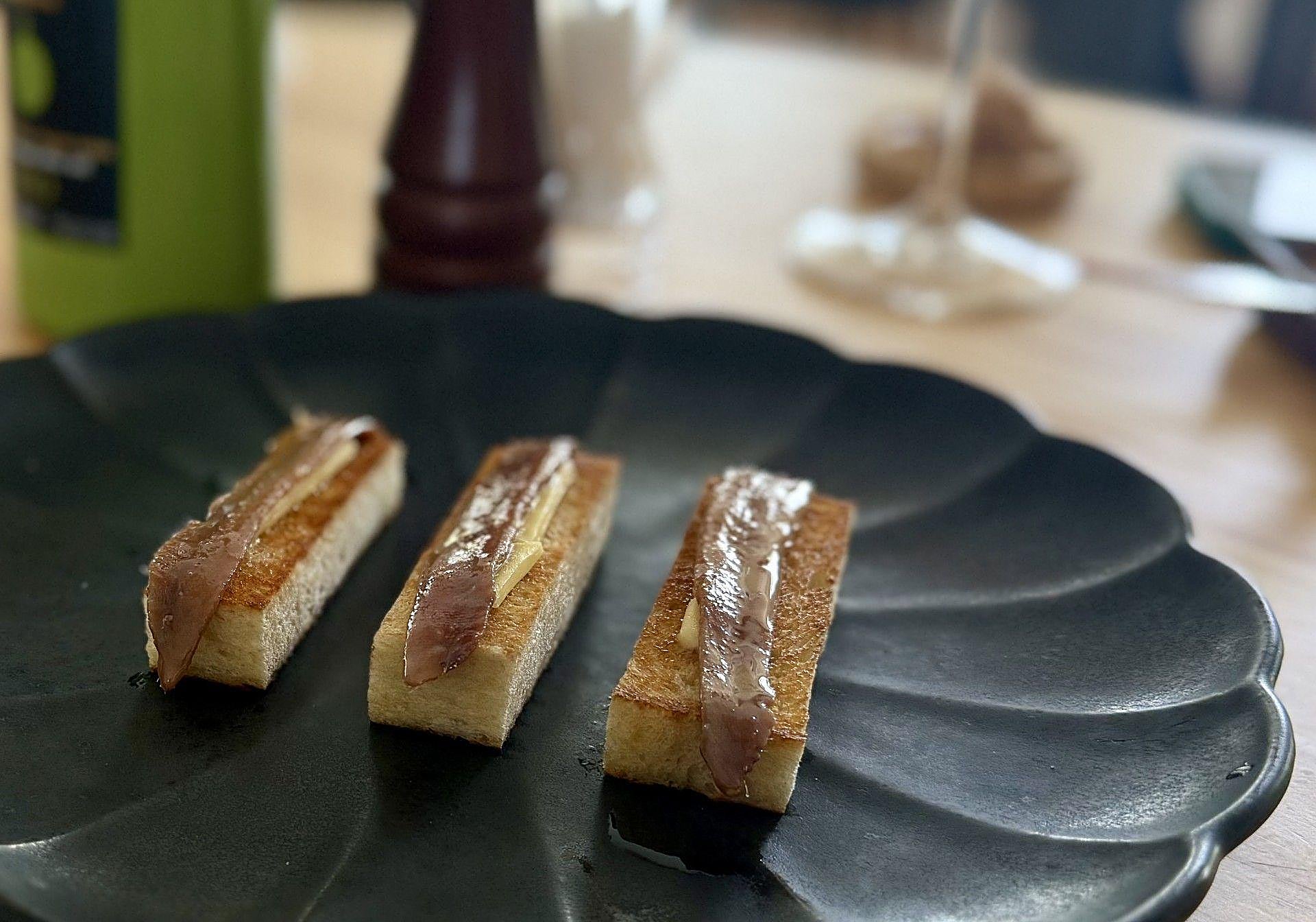 Sus anchoas de Santoña de verdad, calibre 00 salen de cocinas con el tratamiento preciso porque, cuando el producto es excelente no le hace falta más que cariño en cocina, como el que Paco le profesa sobre un esponjoso brioche y una suculenta mantequilla ahumada.