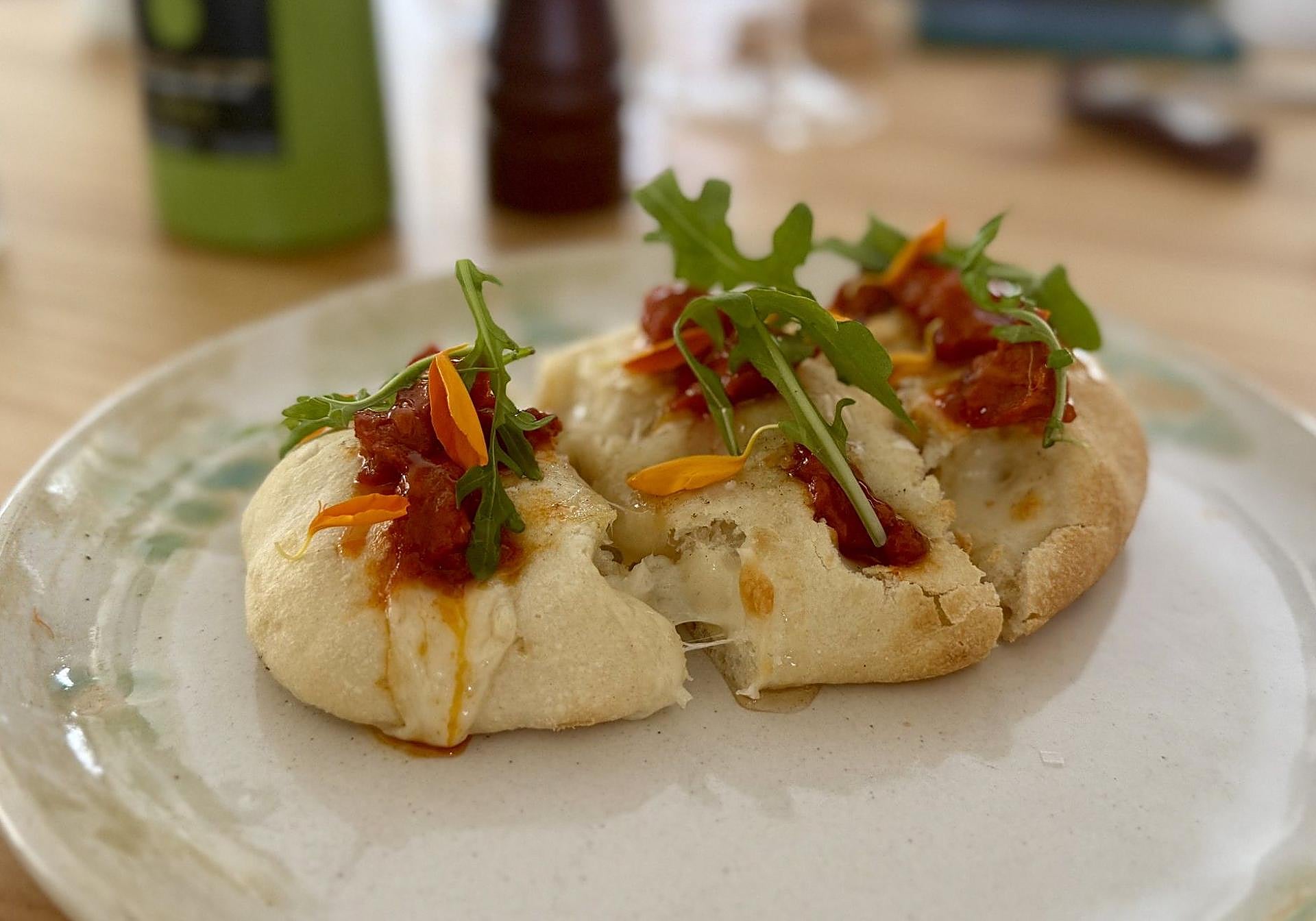 De la mesa que nadie se levante sin probar la coca de aceite, probablemente como reminiscencia a esos años baleares y que ahora despliegan para el público grancanario acompañándola con sobrasada 100% ibérica, queso semi curado de San Mateo y miel de flores. Y no sé si será porque la sobrasada es mi embutido favorito desde mi niñez, pero ya estoy necesitando comérmela otra vez. Sencillamente exquisita además de no encontrar otra igual en toda la isla.
