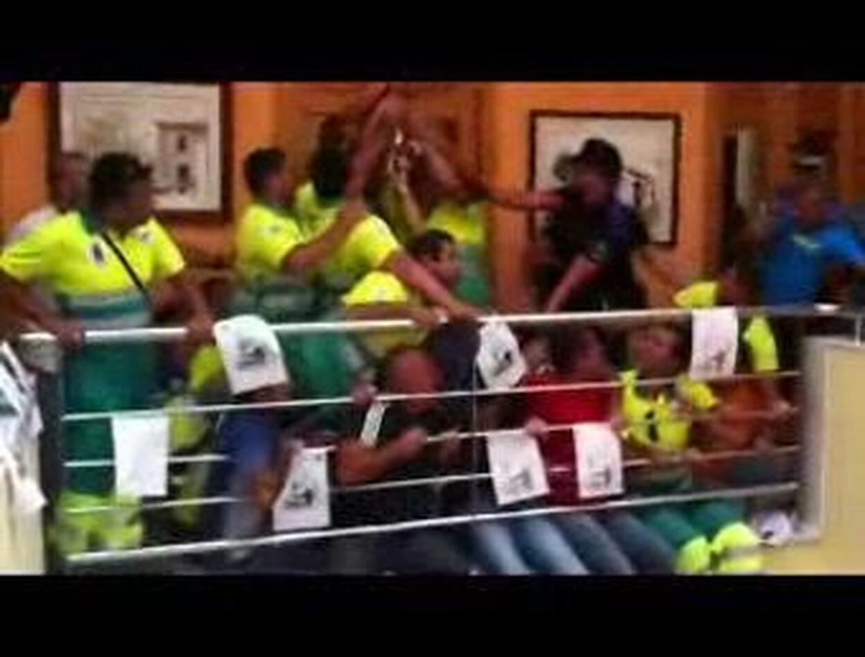 Unos 20 trabajadores del servicio de la basura fueron desalojados a la fuerza del Ayuntamiento de Telde. Cinco de ellos se encadenaron junto a la puerta del despacho de la alcaldesa en protesta por un ERE que afectará a 20 empleados. La Policía Local usó una cizalla para cortar la cadena.