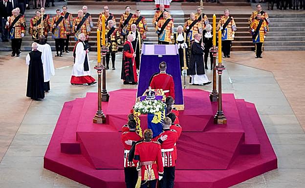 La reina Isabel reposa desde este miércoles en su ataúd de roble en el centro del gran hall de Westminster, donde se instaló la capilla ardiente en una ceremonia presidida por su sucesor, Carlos III, sus hermanos y otros miembros de la familia. El recinto permanecerá abierto al público y los selectos invitados internacionales hasta cinco horas antes del funeral, previsto para el mediodía del lunes (hora española) en la vecina abadía anglicana. El entierro tendrá lugar ese atardecer en el castillo de Windsor, a las afueras de Londres.