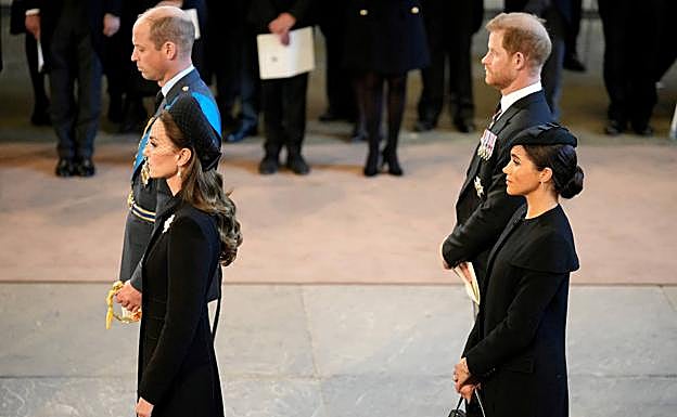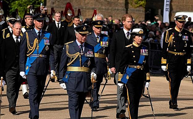 Carlos III, la princesa Ana y los príncipes Eduardo y Guillermo desfilaron en uniforme militar, representando a los Ejércitos de Tierra, Mar y Aire. Los duques de York y Sussex, partícipes en las guerras de las Malvinas y Afganistán, fueron relegados a lucir varias medallas en la solapa de sus chaqués. El estricto protocolo de las funciones de Estado se impuso sobre los díscolos miembros no activos de la monarquía en el preámbulo de la despedida final de su madre y abuela.
