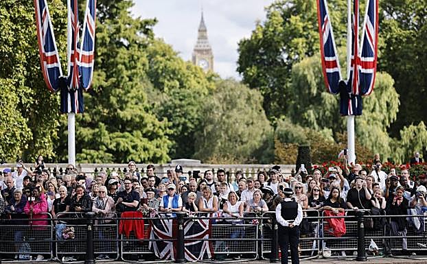 Al sur del palacio, el normalmente solitario paseo Birdcage parecía un escenario de los años de plomo en Irlanda del Norte. Un muro portátil de metal se extendió a través de la calzada, con una estrecha abertura por donde los transeúntes pasaban uno a uno en dirección a Westminster. La plaza del Parlamento estaba vetada al público y otro portón metálico cortó los accesos al puente de la torre del Big Ben y la estación del metro. La procesión de ayer fue simplemente el entrante del plato fuerte del funeral de Estado que congregará a más de un centenar de jefes de Estado y Gobierno en la abadía de Westminster, donde el ataúd llegará el lunes desde el histórico hall del complejo parlamentario.