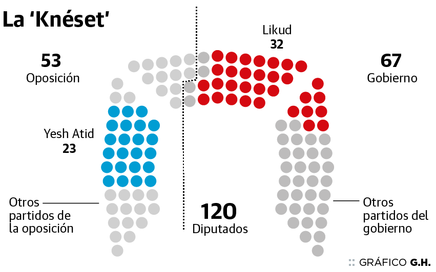 Israel es un país peculiar en muchos aspectos. En primer lugar, no cuenta con una Constitución, cuya redacción se ha ido posponiendo 'sine die'. En su lugar existe una serie de trece leyes básicas que regulan diferentes aspectos de la gobernanza y que en algún momento serán incorporadas como capítulos de la futura Carta Magna. En segundo lugar, la legislación emana de un parlamento relativamente pequeño que se elige como si todo el país fuese un solo distrito y en el que solo hace falta lograr un 3,25% de los votos para lograr representación. El resultado es un hemiciclo muy fragmentado para un país de 10 millones de habitantes, en el que una docena de partidos que representan los intereses de grupos tan heterogéneos como los ultraortodoxos -que se niegan a ser movilizados en el ejército y han decidido dejar de apoyar a Netanyahu-, los árabes-israelíes o los comunistas, están condenados a buscar alianzas para gobernar.