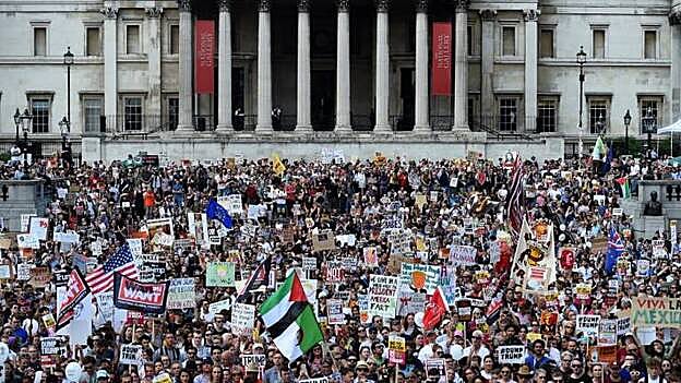 A apenas 40 kilómetros de esa idílica estampa, miles de personas se concentraban en la plaza de Trafalgar al grito de "Dilo alto y claro, Donald Trump no es bienvenido aquí".