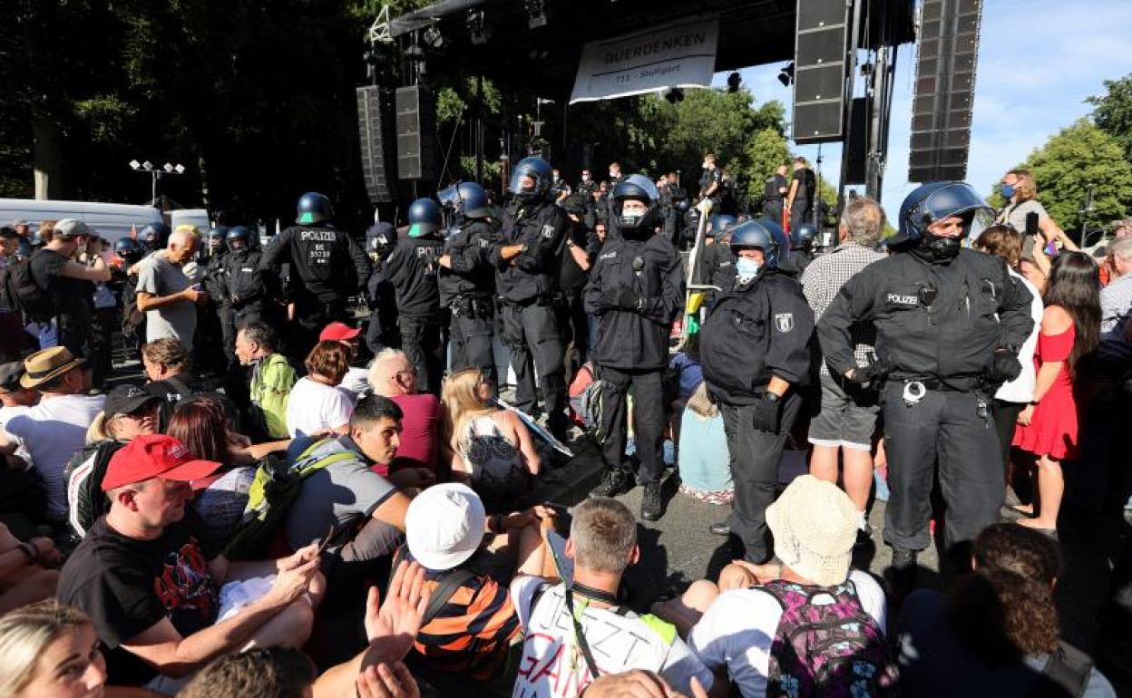 La protesta tenía previsto acabar en la Columna de la Victoria, en el centro de la ciudad, pero la policía suspendió la manifestación antes de llegar a ese punto (la concentración posterior no se vio afectada). «El organizador no está en disposición de que se cumplan las medidas de seguridad», aseguró un portavoz policial, que insistió en que los participantes no mantenían el metro y medio de distancia de seguridad ni llevaban mascarillas. Entonces se produjeron los únicos incidentes de la jornada. Agentes accedieron al escenario donde se iba a leer el manifiesto final para sacar a los organizadores allí subidos y en algún caso tuvieron que emplear la fuerza. Desde abajo la multitud abucheó a los policías. «Debido a que no se han respetado las normas de distanciamiento se ha denunciado al responsable de la manifestación», escribió en Twitter la Policía de Berlín.