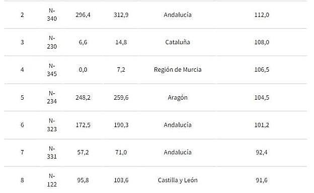 Además, entre los ocho tramos negros del trienio 2018-2020, dos vuelven a aparecer como reincidentes: la N-340 en Granada, con un IR que pasó de 93,6 a 112; y la N-345 en Murcia, que pasó del 98,6 a 106,5. Estos dos, según RACE, «han sido la evolución de situaciones que se venían anunciando en estudios anteriores y en los que no se han llevado a cabo las medidas correctoras pertinentes.