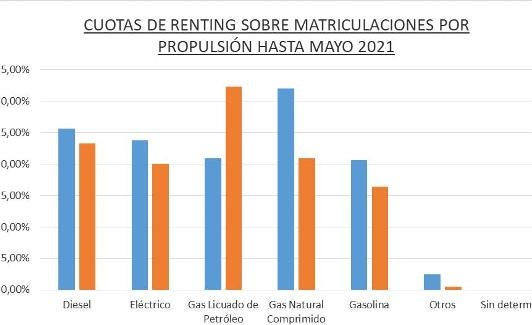 Por tipos de propulsión, hasta mayo de 2021 se matricularon en renting 48.535 vehículos diesel, lo que representó el 47,6% del total adquirido en renting. Los vehículos a gasolina registrados en renting fueron 50.017, el 49% del total.