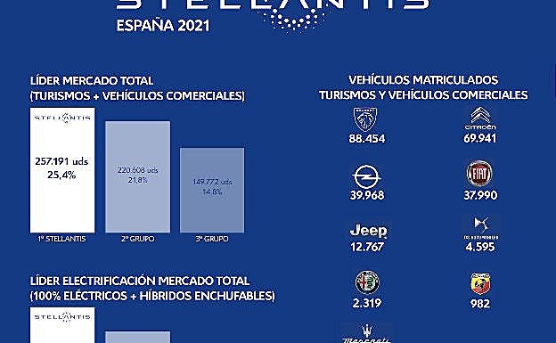 En su primer año de actividad, el grupo Stellantis se sitúa en el primer puesto del mercado total en España, con 257.191 turismos y vehículos comerciales matriculados, que representan un 25,4% del total. Es decir, uno de cada cuatro vehículos matriculados en España en 2021 pertenece a una de las marcas que Stellantis comercializa en nuestro país. Una de ellas, Peugeot, logra ser líder en el mercado total español por cuarto año consecutivo, con 88.454 matriculaciones y un 8,7% de cuota.