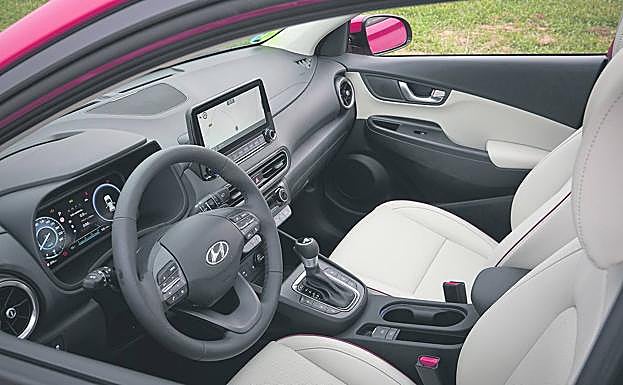 El interior del nuevo KONA se completa con nuevos colores y materiales. Según el acabado, la tapicería de los asientos puede tener un diseño de pata de gallo tejida en negro, asientos de tela con relieve negro y gris, y asientos de cuero perforado en negro, beige o caqui. Estos dos últimos colores solo disponibles en el KONA Híbrido.