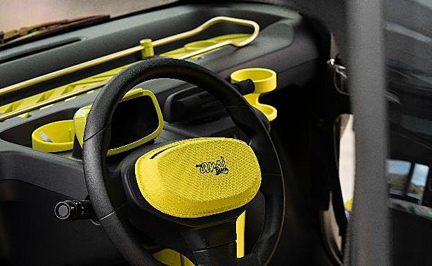 Asimismo, el estilo del My Ami Buggy Concept tiene su mejor reflejo en su combinación de colores. El Anodized Khaki es un guiño a la naturaleza y es protagonista en la parte delantera, mientras que el Spreckled Black predomina en la zaga, dando un aire moderno a la carrocería. Además, se ha elegido el Citric Yellow en detalles como los asientos, el cable de recarga o los embellecedores.