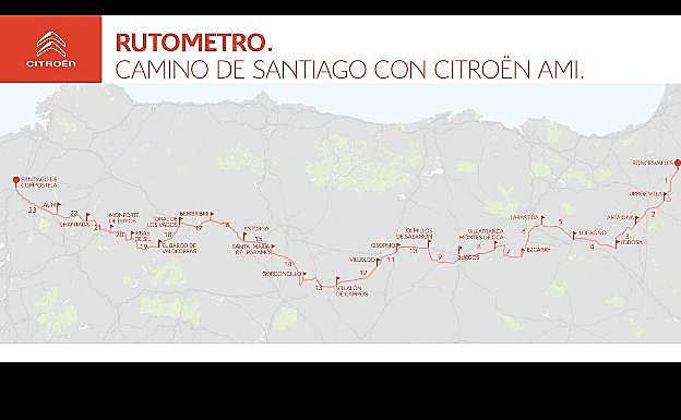 El Citroën Ami da muestra de su personalidad cuando al llegar a Belorado, cuando deja atrás la carretera comarcal y se incrusta en el tráfico rodado de la Nacional-120, donde los camiones se aproximan al artefacto como si fuera la película 'El diablo sobre ruedas' de Steven Spielberg. Moles gigantescas, de 18 toneladas que se aproximan a 90 km/h y que se colocan a dos metros escasos del artefacto, para adelantarlo en cuanto tienen ocasión, lo que provoca un bamboleo inquietante en el interior del habitáculo. Pero esto forma parte de la aventura que es hacer el Camino. Mientras en paralelo, por la senda que discurre junto a la carretera, una riada de peregrinos cargados con su mochila, avanza hacia Villafranca. Este recorrido, una etapa de las 23, cambiando decorados, condiciones climatológicas y trazados, ha sido la constante. Tras Villafranca de Montes de Oca (Burgos) llegarían las planicies de Tierra de Campos y el ascenso hacia León, Ponferrada y Galicia, para al final entrar en Santiago el 15 de septiembre a las 16 horas, 764 kilómetros después de haber empezado la aventura.