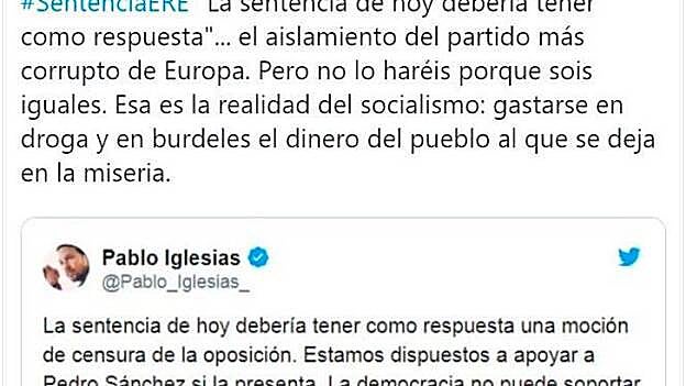 El líder de Vox, Santiago Abascal, ha pedido al de Podemos, Pablo Iglesias, que aísle al PSOE y no pacte con él tras conocerse la sentencia sobre el caso de los ERE. En un tuit, Abascal señala que esta sentencia debería tener como respuesta "el aislamiento del partido más corrupto de España", el PSOE, pero que (Podemos) no lo hará porque "sois iguales".