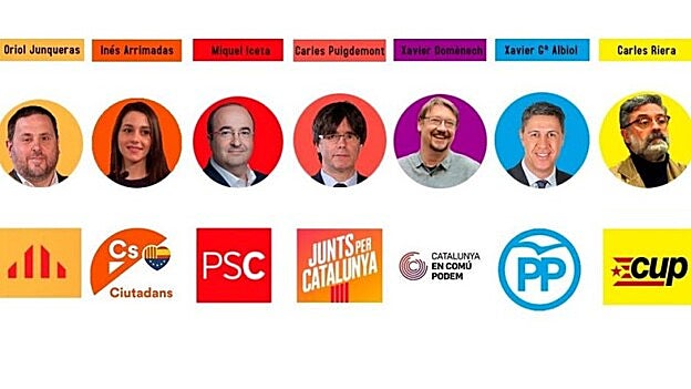 En liza hay tres partidos que apuestan por desplegar, con matices, la República que se declaró en el Parlament: JuntsxCat, ERC y la CUP; otros tres que rechazan la independencia y dieron luz verde al 155, Cs, PSC y PP, y un séptimo, los 'comuns' (CatECP), que se distancian tanto del 155 como de la vía unilateral de los independentistas.