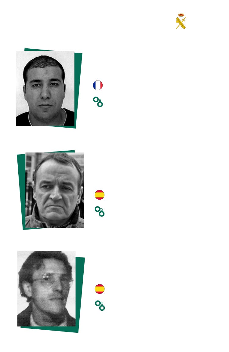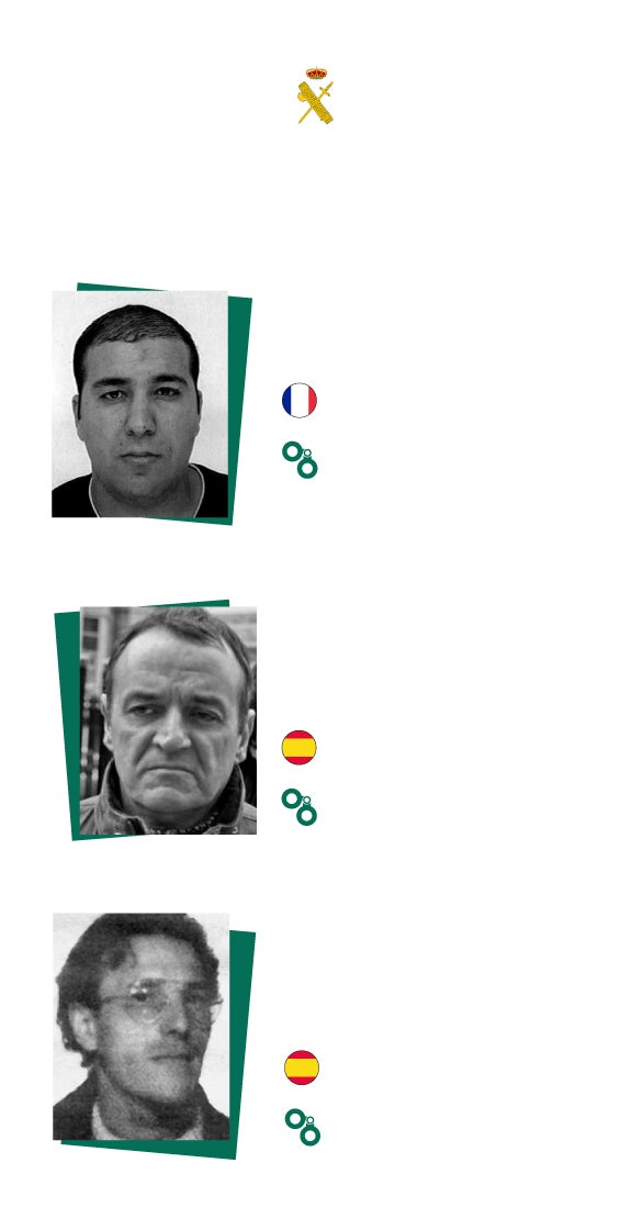 La Guardia Civil también tiene sus listados de 'most wanted' pero este cuerpo es el que menos difusión da a sus elencos que, aun así, también son distribuidos en redes por los internautas. El instituto armado tiene a día de hoy 20 fugitivos en sus más buscados. 14 de ellos son etarras huidos. La Guardia Civil es el cuerpo que con más afán sigue manteniendo 'viva' en las redes la búsquedas de los exactivistas de la banda terrorista disuelta hace más de una década. Dos rostros históricos destacan: José Ignacio de Juana Chaos, huido desde 2008 tras volverse a ordenar su captura después de cumplir 18 años de cárcel de los 3.000 que se le impusieron; y José Luis Eciolaza Galán, alias 'Dienteputo', acusado de una veintena de asesinatos en los ochenta.