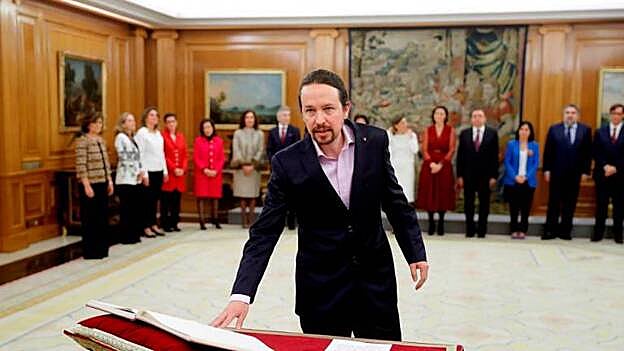 El secretario general de Podemos, Pablo Iglesias, ha tomado este lunes posesión de su cargo como vicepresidente segundo del Gobierno de coalición, siguiendo el protocolo habitual, aunque ha añadido al final la fórmula "Consejo de ministros y ministras". La canaria Carolina Darias, ministra de Política Territorial, fue de las que no necesitó leer el texto escrito para prometer el cargo.