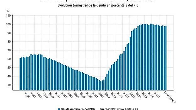 De acuerdo a los datos publicados este viernes por el Banco de España, la deuda de septiembre equivale al 98,3% del PIB, dos décimas por encima de lo que registraba al cierre de junio pero lejos de los máximos de 2014, cuando superaba el 100% del PIB.