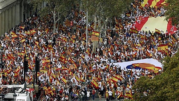 Unas 65.0000 personas, según la Guardia Urbana, se han manifestado este jueves en Barcelona convocadas por Societat Civil Catalana (SCC) y otras entidades para pedir al presidente catalán, Carles Puigdemont, que vuelva al sentido común, que «rectifique» y aproveche el lunes «su oportunidad de oro».