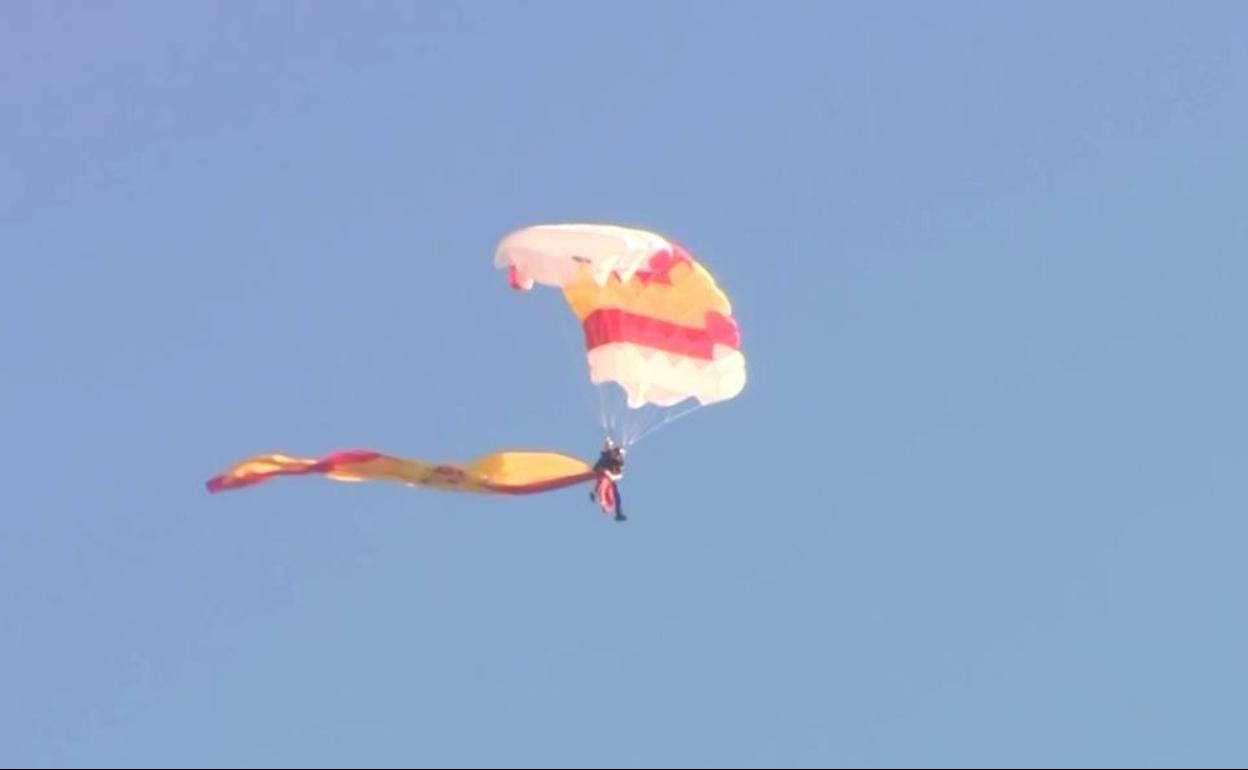 Pequeño percance del paracaidista con la bandera de España en el desfile del 12 de octubre