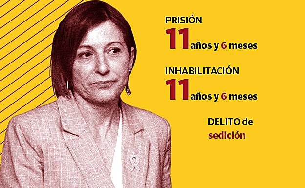 La expresidenta del Parlament fue condenada a 11 años y seis meses de prisión y 11 años y seis meses de inhabilitación por sedición, a pesar de que no se le condena por malversación. La sentencia fue dura con Forcadell, a quien el tribunal atribuyó un papel «decisivo» en el proceso desde su «privilegiada posición». Le acusó de amparar desde esa posición la creación de una «legalidad paralela carente de validez» con las leyes de desconexión, que «formaban parte de una estrategia concertada por los principales acusados» con el objetivo de «crear una aparente cobertura jurídica que permitiera hacer creer a la ciudadanía que cuando depositara su voto estaría contribuyendo al acto fundacional de la república independiente de Cataluña».